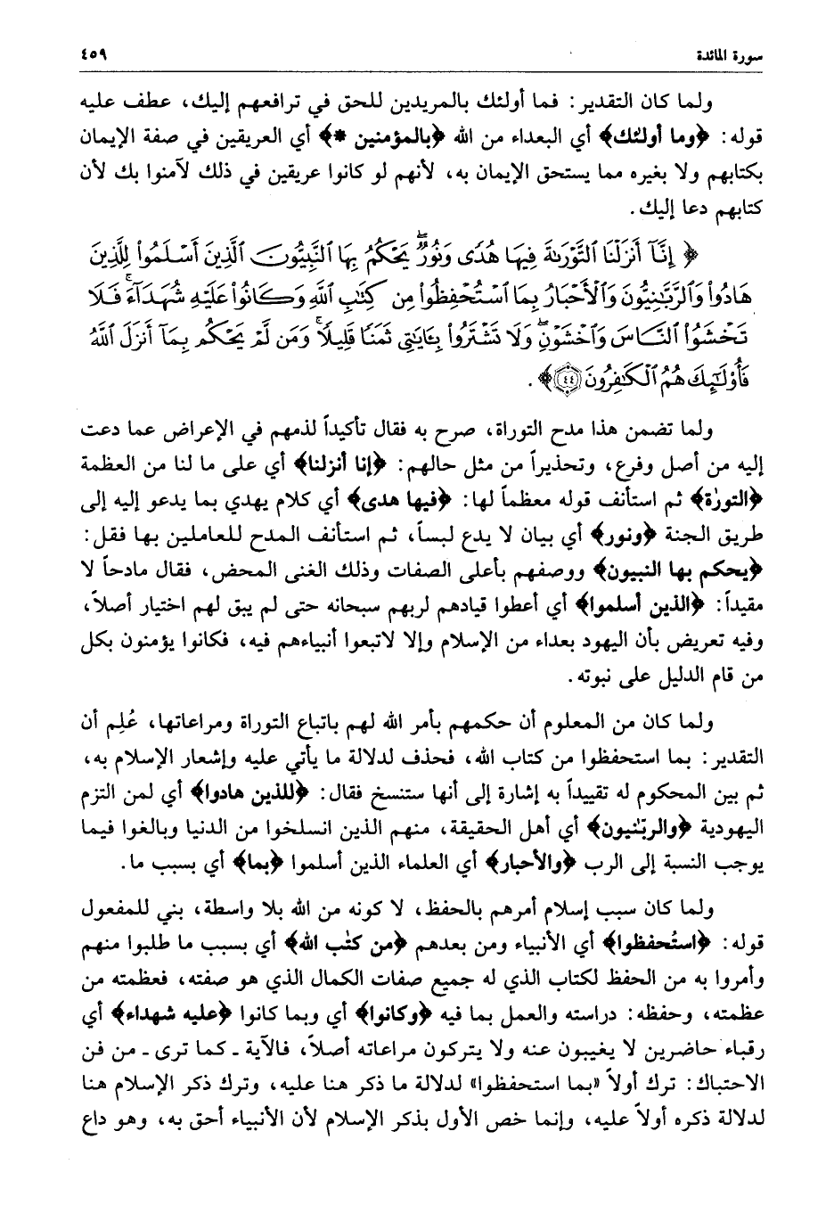 ولما تضمن هذا مدح التوراة ، صرح به فقال تأكيداً لذمهم في الإعراض عما دعت إليه من أصل وفرع ، وتحذيراً من مثل حالهم : ( إنا أنزلنا ) أي على ما لنا من العظمة ) التوراة ( ثم استأنف قوله معظماً لها : ( فيها هدى ) أي كلام يهدي بما يدعو إليه إلى طريق الجنة ) ونور ) أي بيان لا يدع لبساً ، ثم استأنف المدح للعاملين بها فقل : ( يحكم بها النبيون ( ووصفهم بأعلى الصفات وذلك الغنى المحض ، فقال مادحاً لا مقيداً : ( الذين أسلموا ) أي أعطوا قيادهم لربهم سبحانه حتى لم يبق لهم اختيار اصلاً ، وفيه تعريض بأن اليهود بعداء من الإسلام وإلا لاتبعوا أنبياءهم فيه ، فكانوا يؤمنون بكل من قام الدليل على نبوته .