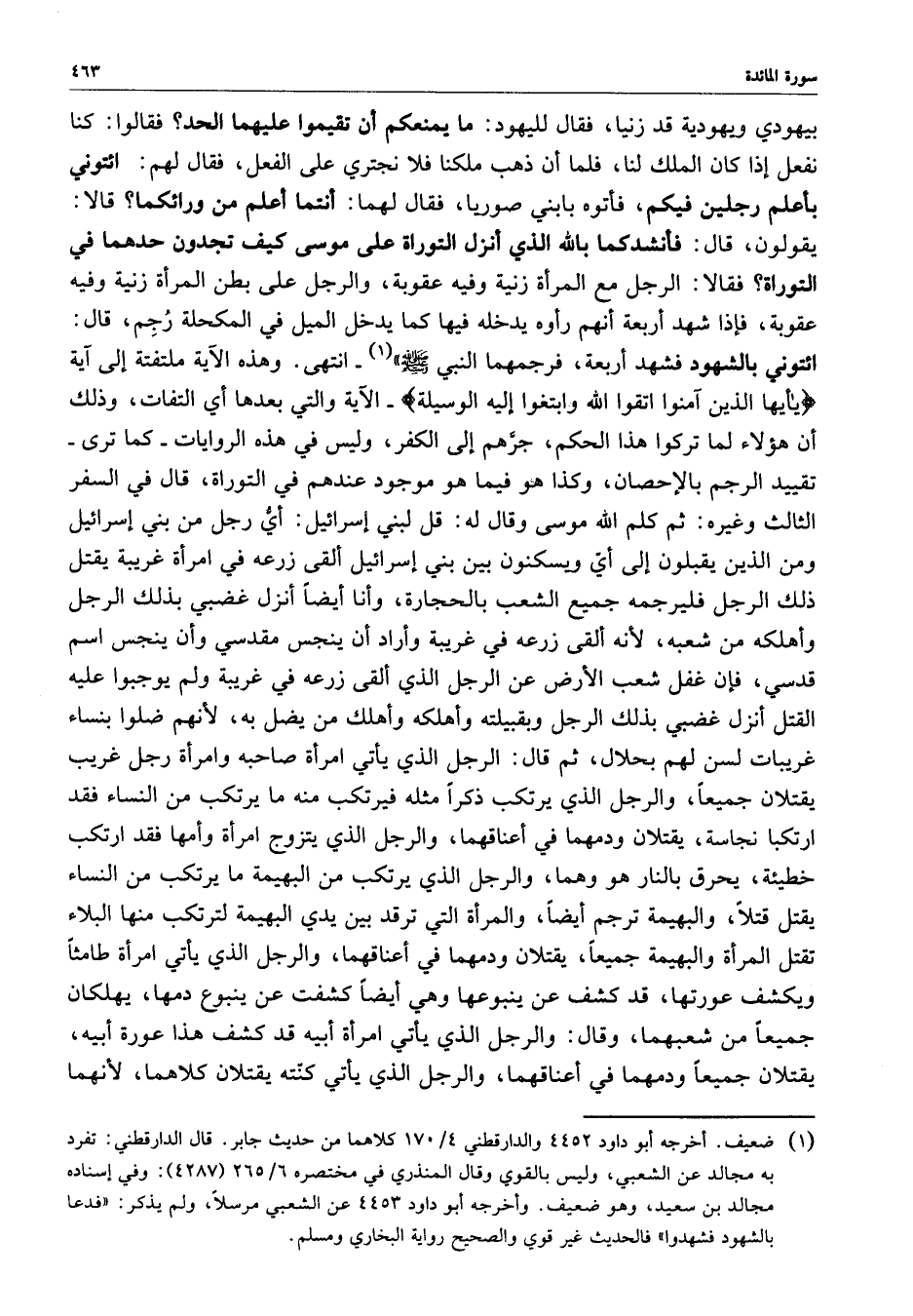 بيهودي ويهودية قد زنيا ، فقال لليهود : ( ما يمنعكم أن تقيموا عليهما الحد ؟ ) فقالوا : كنا نفعل إذا كان الملك لنا ، فلما أن ذهب ملكنا فلا نجتري على الفعل ، فقال لهم : ( ائتوني بأعلم رجلين فيكم ) ، فأتوه بابني صوريا ، فقال لهما : أنتم أعلم من ورائكما ؟ قالا : يقولون ، قال : ( فأنشدكما بالله الذي أنزل التوراة على موسى كيف تجدون حدهما في التوراة ؟ ) فقالا : الرجل مع المرأة زنية وفيه عقوبة ، والرجل على بطن المرأة زنية وفيه عقوبة ، فإذا شهد أربعة أنهم رأوه يدخله فيها كما يدخل الميل في المكحلة رُجِم ، قال : ائتوني بالشهود فشهد أربعة ، فرجمهما النبي ( صلى الله عليه وسلم ) ( - انتهى .