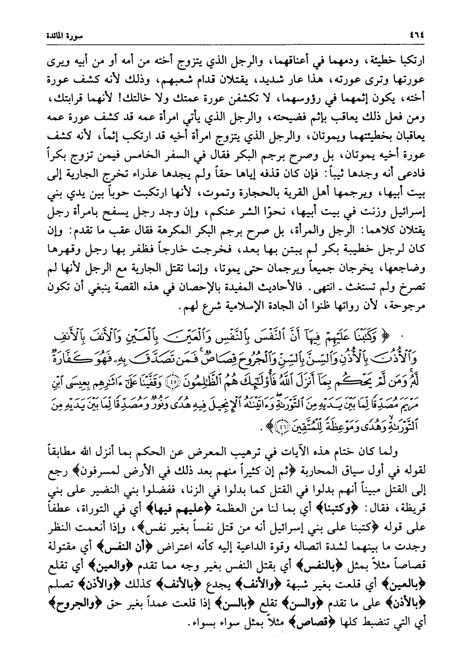 ) وَكَتَبْنَا عَلَيْهِمْ فِيهَآ أَنَّ النَّفْسَ بِالنَّفْسِ وَالْعَيْنَ بِالْعَيْنِ وَالأَنْفَ بِالأَنْفِ وَالأُذُنَ بِالأُذُنِ وَالسِّنَّ بِالسِّنِّ وَالْجُرُوحَ قِصَاصٌ فَمَن تَصَدَّقَ بِهِ فَهُوَ كَفَّارَةٌ لَّهُ وَمَن لَّمْ يَحْكُم بِمَآ أنزَلَ اللَّهُ فَأُوْلَئِكَ هُمُ الظَّالِمُونَ وَقَفَّيْنَا عَلَى آثَارِهِم بِعَيسَى ابْنِ مَرْيَمَ مُصَدِّقاً لِّمَا بَيْنَ يَدَيْهِ مِنَ التَوْرَاةِ وَآتَيْنَاهُ الإِنجِيلَ فِيهِ هُدًى وَنُورٌ وَمُصَدِّقاً لِّمَا بَيْنَ يَدَيْهِ مِنَ التَّوْرَاةِ وَهُدًى وَمَوْعِظَةً لِّلْمُتَّقِينَ ( ( )