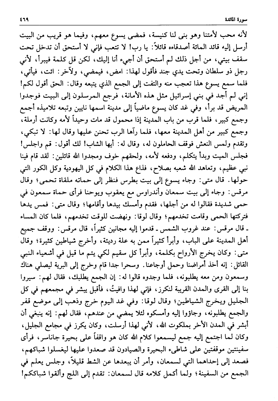لأنه محب لأمتنا وهو بنى لنا كنيسة ، فمضى يسوع معهم ، وفيما هو قريب من البيت أرسل إليه قائد المائة أصدقاءه قائلاً : يا رب لا تتعب فإني لا أستحق أن تدخل تحت سقف بيتي ، من أجل في بني إسرائيل مثل هذه الأمانة ، فرجع المرسلون إلى اليبت فوجدوا المريض قد برأ ، وفي غد كان يسوع ماضياً إلى مدينة اسمها نايين وتبعه تلاميذه أجمع وجمع كبير ، فلما قرب من باب المدينة إذا محمول قد مات وحيداً لأمه وكانت أرملة ، وجمع كبير من أهل المدينة معها ، فلما رآها الرب تحنن عليها وقال لها : لا تبكي ، وتقدم ولمس النعش فوقف الحاملون له ، وقال له : أيها الشاب لك أقول : قم واجلس فجلس الميت وبدأ يتكلم ، ودفعه لأمه ، ولحقهم خوف ومجدوا الله قائلين : لقد قام فينا نبي عظيم ، وتعاهد الله شعبه بصلاح ، فذاع هذا الكلام في كل اليهودية وكل الكور التي حولها .