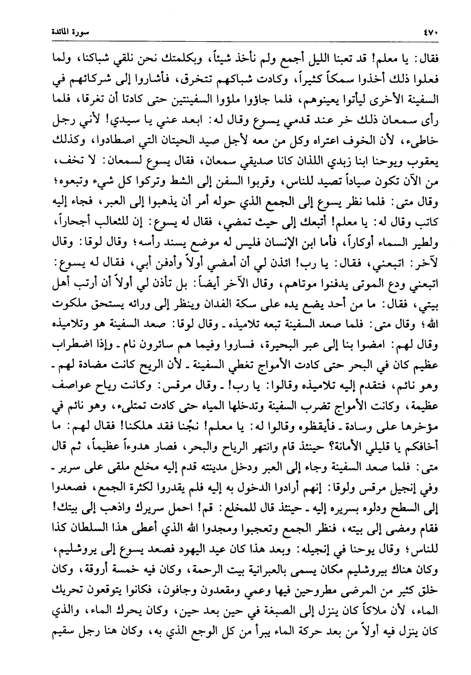 فقال : يا معلم قد تعبنا الليل أجمع ولم نأخذ شيئاً ، وبكلمتك نحن نلقي شباكنا ، ولما فعلوا ذلك أخذوا سمكاً كثيراً ، وكادت شباكهم تتخرق ، فأشاروا إلى شركائهم في السفينة الأخرى ليأتوا يعينوهم ، فلما جاؤوا ملؤوا السفينتين حتى كادتا أن تغرقا ، فلما رأى سمعان ذلك خر عند قدمي يسوع وقال له : ابعد عني يا سيدي لأني رجل خاطىء ، لأن الخواف اعتراه وكل من معه لأجل صيد الحيتان التي اصطادوا ، وكذلك يعقوب ويوحنا ابنا زبدي اللذان كانا صديقي سمعان ، فقال يسوع لسمعان : لا تخف ، من الآن تكون صياداً تصيد للناس ، وقربوا السفن إلى الشط وتركوا كل شيء وتبعوه ؛ وقال متى : فلما نظر يسوع إلى الجمع الذي حوله أمر أن يذهبوا إلى العبر ، فجاء إليه كاتب وقال له : يا معلم أتبعك إلى حيث تمضي ، فقال له يسوع : إن للثعالي أجحاراً ، ولطير السماء أوكاراً ، فأما ابن الإنسان فليس له موضع يسند رأسه ؛ وقال لوقا : وقال آخر : اتبعني ، فقال : يا رب ائذن لي أن امضي أولاً وأدفن أبي ، فقال له يسوع : اتبعني ودع الموتى يدفنوا موتاهم ، وقال الآخر أيضاً : بل تأذن لي أولاً أن أرتب أهل بيتي ، فقال : ما من أحد يضع يده على سكة الفدان وينظر إلى ورائه يستحق ملكوت الله ؛ وقال متى : فلما صعد السفينة تبعه تلاميذه - وقال لوقا : صعد السفينة هو وتلاميذه وقال لهم : امضوا بنا إلى عبر البحيرة ، فساروا وفيما هم سائرون نام - وإذا اضطراب عظيم كان في البحر حتى كادت الأمواج تغطي السفينة - لأن الريح كانت مضادة لهم - وهو نائم ، فتقدم إليه تلاميذه وقالوا : يا رب - وقال مرقس : وكانت رياح عواصف عظيمة ، وكانت الأمواج تضرب السفينة وتدخلها المياه حتى كادت تمتلىء ، وهو نائم في مؤخرها على وسادة - فأيقظوه وقالوا له : يا معلم نجِّنا فقد هلكنا فقال لهمخ : ما أخافكم يا قليلي الأمانة ؟ حينئذ قام وانتهر الرياح ولابرح ، فصار هدوءاً عظيماً ، ثم قال متى : فلما صعد السفينة وجاء إلى العبر ودخل مدينته قدم إليه مخلع ملقى على سرير - وفي إنجيل مرقس ولوقا : إنهم أرادوا الدخول به إليه فلم يقدروا لكثرة الجمع ، فصعدوا إلى السطح ودلوه بسريره إليه - حينئذ قال للمخلع : قم امل سريرك واذهب إلى بيتك فقام ومضى إلى بيته ، فنظر الجمع وتعجبوا ومجدوا الله الذي أعطى هذا السلطان كذا للناس ؛ وقال يوحنا في إنجيله : وبعد هذا كان عيد اليهود فصعد يسوع إلى يروشليم ، وكان هناك بيروشليم مكان يسمى بالعبرانية بيت الرحمة ، وكان فيه خمسة أروقة ، وكان خلق كثير من المرضى مطروحين فيها وعمي ومقعدون وجافون ، فكانوا يتوقعون تحريك الماء ، لأن ملاكاً كان ينزر إلى الصبغة في حين بعد حين ، وكان يحرك الماء ، والذي كان ينزل فيه أولاً من بعد حركة الماء يبرأ من كل الوجع الذي به ، وكان هنا رجل سقيم