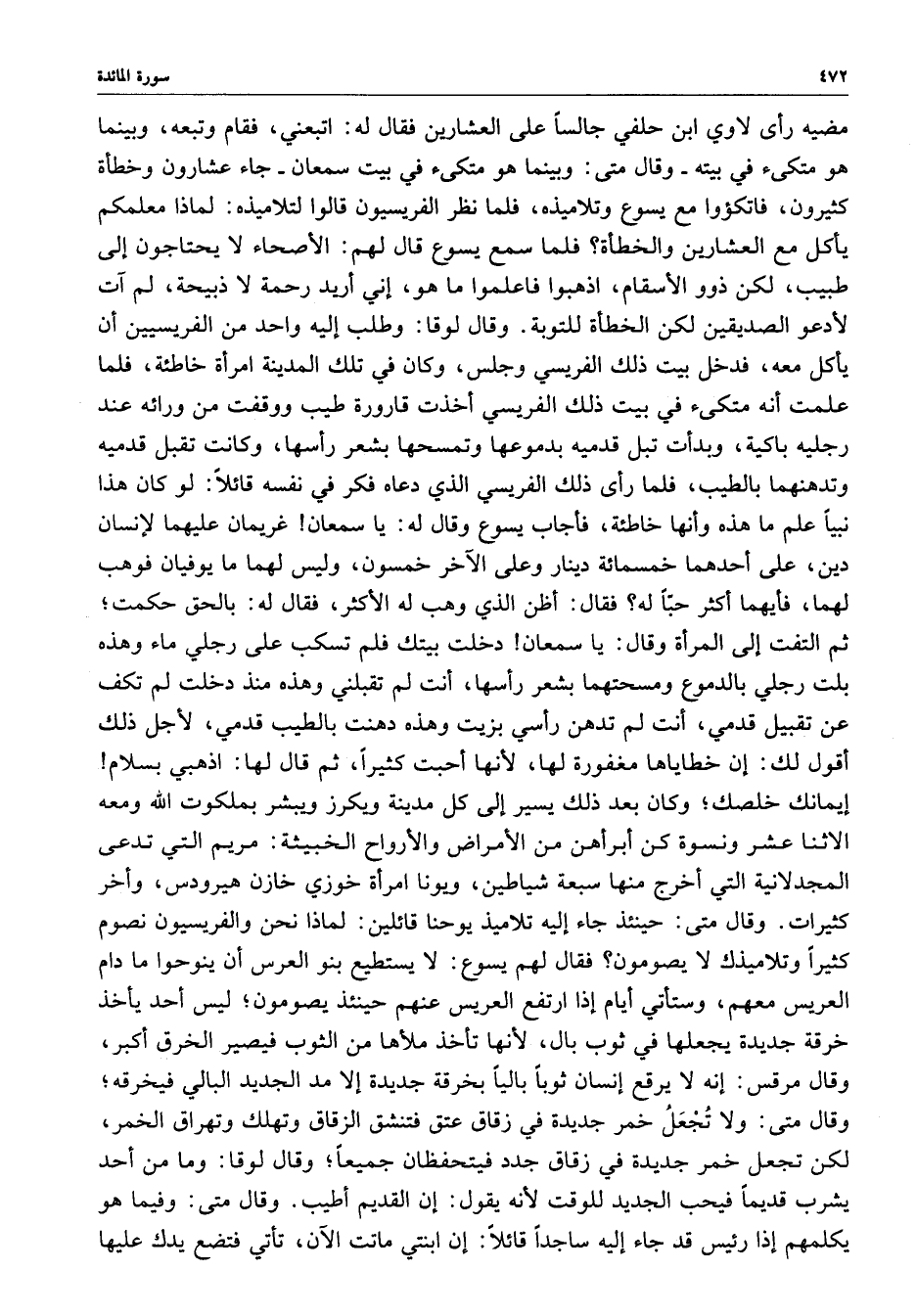 وقال لوقا : وطلب إليه واحد من الفريسيين أن يأكل معه ، فدخل بيت ذلك الفريسي وجلس ، وكان في تلك المدينة امرأة خاطئة ، فلما علمت أنه متكىء في بيت ذلك الفريسي أخذت قارورة طيب ووقفت من ورائه عند رجليه باكية ، وبدأت تبل قدميه بدموعها وتمسحها بشعر رأسها ، وكانت تقبل قدميه وتدهنهما بالطيب ، فلما رأى ذلك الفريسي الذي دعاه فكر في نفسه قائلاً : لوكان هذا نبياً علم ما هذه وأنها خطائة ، فأجاب يسوع وقال له : يا سمعان غريمان عليها لإنسان دين ، على أحدهما خمسمائة دينار وعلى الآخر خمسون ، وليس لهما ما يوفيان فوهب لهما ، فأيهما أكثر حبّاً له ؟ فقال : أظن الذي وهب له الأكثر ، فقال له : بالحق حكمت ؛ ثم التفت إلى المرأة وقال : يا سمعان دخلت بيتك فلم تسكب على رجلي ماء وهذه بلت رجلي بالدموع ومسحتهما بشعر رأسها ، أنت لم تقبلني وهذه منذ دخلت لم تكف عن تقبيل قدمي ، أنت لم تدهن رأس بزيت وهذه دهنت بالطيب قدمي ، لأجل ذلك أقول لك : إن خطاياه مغفورة لها ، لأنها أحبت كثيراًن ثم قال لها : اذهبي بسلام إيمانك خلصك ؛ وكان بعد ذلك يسير إلى كل مدينة ويكرز ويبشر بملكوت الله ومعه الاثنا عشر ونسوة كن أبرأهن من الأمراض والأرواح الخبيثة : مريم التي تدعى المجدلانية التي أخرج منها سبعة شياطين ، ويونا امرأة خوزي خازن هيرودس ، وأخر كثيرات .