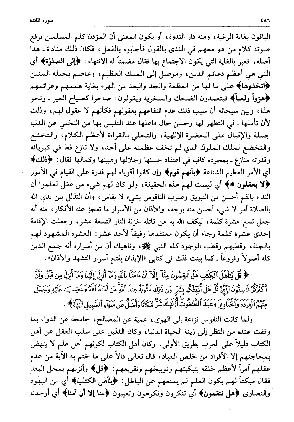 الباقون بغاية الرغبة ، ومنه دار الندوة ، أو يكون المعنى أن المؤذن كلم المسلمين برفع صوته كلام من هو معهم في الندى بالقول فأجابوه بالفعل ، فكان ذلك مناداة - هذا أصله ، فعبر بالغاية التي يكون الاجتماع بها فقال مضمناً له الانتهاء : ( إلى الصلاة ) أي التي هي أعظم دعائم الدين ، وموصل إلى الملك العظيم ، وعاصم بحبلة المتين ) اتخذوها ( على ما لها من العظمة والجد والبعد من الهزء بغاية هممهم وعزائمهم ) هزواً ولعباً ( فيتعمدون الضحك والسخرية ويقولون : صاحوا كصياح العير - ونحو هذا ، وبين سبحانه أن سبب ذلك عدم انتفاعهم بعقولهم فكأنهم لا عقول لهم ، وذلك لأن تأملها - في التطهر لها وحسن حال فاعلها عند التلبس بها من التخلي عن الدنيا جملة والإقبال على الحضرة الإلهية ، والتحلي بالقراءة لأعظم الكلام ، والتخشع والتخضع لملك الملوك الذي لم تخف عظمته على أحد ، ولا نازع قط في كبريائه وقدرته منازع - بمجرده كافٍ في اعتقاد حسنها وجلالها وهيبتها وكمالها فقال : ( ذلك ) أي الأمر العظيم الشناعة ) بأنهم قوم ( وإن كانوا أقوياء لهم قدرة على القيام في الأمور ) لا يعقلون ) أي ليست لهم هذه الحقيقة ، ولو كان لهم شيء من عقل لعلموا أن النداء بالفم أحسن من التبويق وضرب الناقوس بشيء لا يقاس ، وأن التذلل بين يدي الله بالصلاة أمر لا شيء أحسن منه بوجه ، وللأذان من الأسرار ما تعجز عنه الأفكار ، منه أنه جعل تسع عشرة كلمة ، ليكف الله به عن قائله خزنة النار التسعة عشر ، وجعلت الإقامة إحدى عشرة كلمة رجاء أن يكون معتقدها رفيقاً لأحد عشر : العشرة المشهود لهم بالجنة ، وقطبهم وقطب الوجود كله النبي ( صلى الله عليه وسلم ) ، وناهيك أن من أسراره أنه جمع الدين كله أصولاً وفروعاً - كما بنت ذلك في كتابي ( الإيذان بفتح أسرار التشهد والأذان ) .