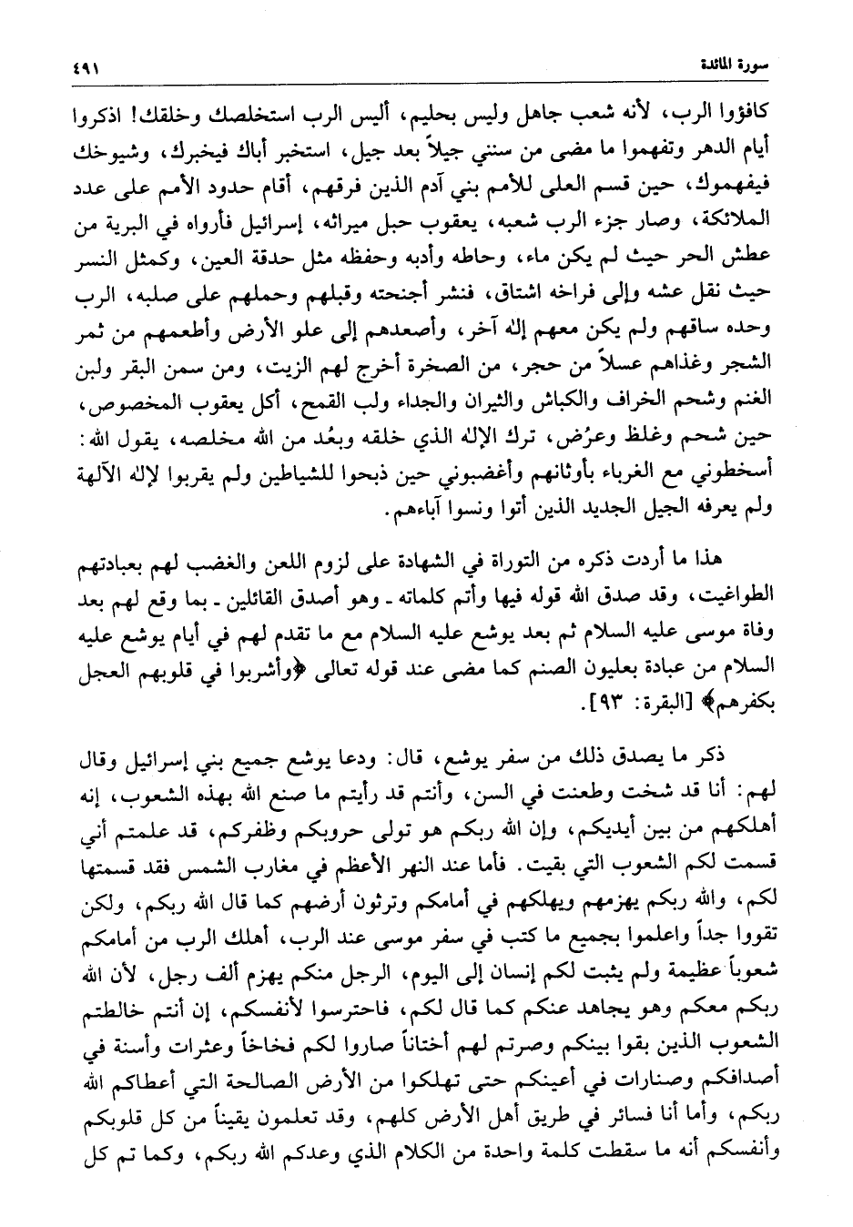 [ البقرة : 93 ] ذكر ما يصدق ذلك من سفر يوشع ، قال : ودعا يوشع جميع بني إسرائيل وقال لهم : أنا قد شخت وطعنت في السن ، وأنتم قد رأيتم ما صنع الله بهذه الشعوب ، إنه أهلكهم من بين أديكم ، وإن الله ربكم هو تولى حروبكم وظفركم ، قد علمتم أني قسمت لكم الشعوب التي بقيت .