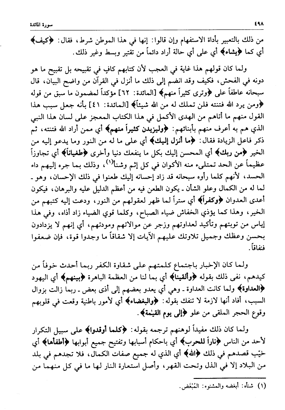 [ المائدة : 41 ] بأنه جعل سبب هذا القول منهم ما أتاهم من الهدى الأكمل في هذا الكتاب المعجز على لسان هذا النبي الذي هم به أعرف منهم بأبنائهم : ( وليزيدن كثيراً منهم ) أي ممن أراد الله فتته ، ثم ذكر فاعل الزيادة فقال : ( ما أنزل إليك ) أي على ما له من النور وما يدعو إيله من الخير ) من ربك ) أي المحسن إليك بكل ما ينفعك دنيا وأخرى ) طغياناً ) أي تجاوزاً عظيماً عن الحد تمتلىء منه الأكوان في كل إثم وشنأ ، وذلك بما جره إليهم داء الحسد ، لأنهم كلما رأوه سبحانه قد زاد إحسانه إليك طعنوا في ذلك الإحسان ، وهو - لما له من الكمال وعلو الشأن - يكون الطعن فيه من أعظم الدليل عليه والبرهان ، فيكون أعدى العدوان ) وكفراً ) أي ستراً لما ظهر لعقولهم من النورن ودعت إليه كتبهم من الخير ، وهذا كما يؤذي الخفاش ضياء الصباح ، وكلما قوي الضياء زاد أذاه ، وفي هذا إياس من توبتهم وتأكيد لعداوتهم وزجر عن موالاتهم ومودتهم ، أي إنهم لا يزدادون بحسن وعظم وجميل تلاوتك عليهم الآيات إلا شقاقاً ما وجدوا قوة ، فإن ضعفوا فنفاقاً .