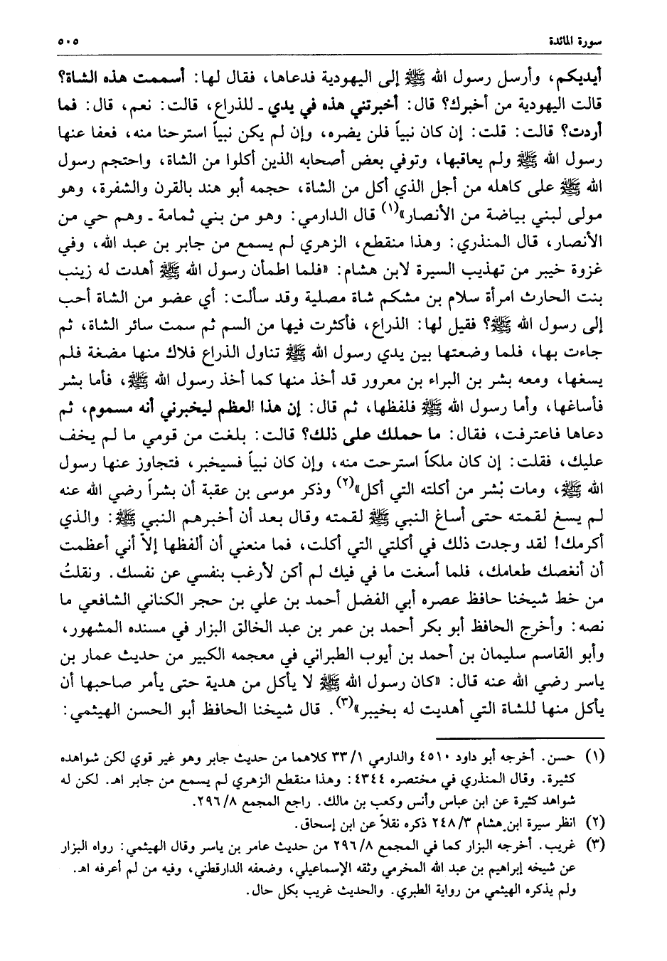أيديكم ( وأرسل رسول الله ( صلى الله عليه وسلم ) إلى اليهودية فدعاها ، فقال لها : ( أسممت هذه الشاة ؟ ( قالت اليهودية من أخبرك ؟ قال : ( أخبرتني هذه في يدي ( - للذراع ، قالت : نعم ، قال : ( فما أردت ؟ ( قالت : قلت : إن كان نبياً فلن يضره ، وإن لم يكن نبياً استرحنا منه ، فعفا عنها رسول الله ( صلى الله عليه وسلم ) ولميعاقبها ، وتوفي بعض أصحابه الذين أكلوا من الشاة ، واحتجم رسول الله ( صلى الله عليه وسلم ) ولم يعاقبها ، وتوفي بعض أصحابه الذين أكلوا من الشاة ، واحتجم رسول الله صلى الله عليه سولم على كاهله من أجل الذي أكل من الشاة ، حجمه أو هند بالقرن والشفرة ، وهو مولى لبني بياضة من الأنصار ) قال الدارمي : وهو من بني ثمامة - وهم حي من الأنصار ، قال المنذري : وهذا منقطع ، الزهري لم يسمع من جابر بن عبد الله ، وفي غزوة خيبر من تهذيب السيرة لابن هشام : ( فلما اطمأن رسول الله ( صلى الله عليه وسلم ) أهدت له زينب بنت الحارثة امرأة سلام بن مشكم شاة مصلية وقد سألت : أي عضو من الشاة أحب إلى رسول الله ( صلى الله عليه وسلم ) ؟ فقيل لها : الذراع ، فأكثرت فيها من السم ثم سمت سائر الشاة ، ثم جاءت بها ، فلما وضعتها بين يدي رسول الله ( صلى الله عليه وسلم ) تناول الذراع فلاك منها مضغة فلم يسغها ، ومعه بشر بن البراء بن معرور قد أخذ منها كما أخذ رسول الله ( صلى الله عليه وسلم ) ، فأما بشر فأساغها ، وأما رسول الله ( صلى الله عليه وسلم ) فلفظها ، ثم قال : ( إن هذا العظم ليخبرني أنه مسموم ( ، ثم دعاها فاعترفت ، فقال : ( ما حملك على ذلك ؟ ( قالت : بلغت من قومي ما لم يخف عليك ، فقلت : إن كان ملكاً استرحت منه ، وإن كان نبياً فسيخبر ، فتجاوز عنها رسول الله ( صلى الله عليه وسلم ) ، ومات بْشر من أكلته التي أكل ) وذكر موسى بن عقبة أن بشراً رضي الله عنه لم يسغ لقمته حتى أساغ النبي ( صلى الله عليه وسلم ) لقمته وقال بعد أن أخبرهم النبي ( صلى الله عليه وسلم ) : والذي أكرمك لقد وجدت ذلك في أكلتي التي أكلت ، فما منعني أن ألفظها إلاّ أني أعظمت أن أنغصك طعامك ، فلما أسغت ما في فيك لم أكن لأرغب بنفسي عن نفسك .