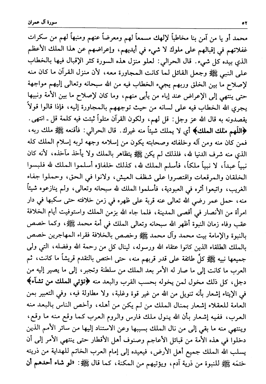 قال الحرالي : فأقنعه ( صلى الله عليه وسلم ) ملك ربه ، فمن كان منه ومن آله وخلفائه وصحابته يكون من إسلامه وجهه لربه إسلام الملك كله الذي منه شرف الدنيا لله ، فلذلك لم يكن ( صلى الله عليه وسلم ) يتظاهر بالملك ولا يأخذه مآخذه ، لأنه كان نبياً عبداً ، لا نبياً ملكاً ، فأسلم الملك لله ، كذلك خلفاؤه اسلموا الملك لله فلبسوا الخلقان والمرقعات واقتصروا على شظف العيش ، ولانوا في الحق ، وحملوا جفاء الغريب ، واتبعوا اثره في العبودية ، فأسلموا الملك لله سبحانه وتعالى ، ولم ينازعوه شيئاًد منه ، حمل عمر رضي الله عنه قربة على ظهره في زمن خلافته حتى سكبها في دار امرآة من الأنصار في أقصى المدينة ، فلما جاء الله بزمن الملك واستوفيت أيام الخلافة عقب وفاء زمان النبوة أظهر الله سبحانه وتعالى الملك في أمة محمد ( صلى الله عليه وسلم ) ، وكما خصص بالنبوة والإمامة بيت محمد وآل محمد ( صلى الله عليه وسلم ) وخصص بالخلافة فقراء المهاجرين خصص بالملك الطلقاء الذين كانوا اعتقاء الله ورسوله ، لينال كل من رحمة الله وفضله ، التي ولى جميعها نبيه ( صلى الله عليه وسلم ) كلَّ طائفة على قدر قربهم منه ، حتى اختص بالتقدم قريشاً ما كانت ، ثم العرب ، ففيه إشعار بأن الله ينول ملك فارس والروم العرب كما وقع منه ما وقع ، دجل ، كل ذلك مخول لمن يخوله بحسب لاقرب والبعد منه ) تؤتي الملك من تشاء ( في الإيتاء إشعار بأنه تنويل من الله من غيره قوة وغلبة ، ولا مطاولة فيه ، وفي التعبير بمن العامة للعقلاء إشعار بمنال الملك من لم يكن من أهله ، وأخص الناس بالبعد منه العرب ، ففيه إشعار بأن الله ينول ملك فارس والروم العرب كما وقع منه ما وقع ، وينتهي منه ما بقي إلى من نال الملك بسببها وعن الاستناد إليها من سائر الأمم الذين دخلوا في هذه الأمة من قبائل الأعاجم وصنوف أهل الأقطار حتى ينتهي الأمر إلى أن يسلب الله الملك جيمع أهل الأرض ، فيعيده إلى إمام العرب الخاتم للهداية من ذريته ختمه ( صلى الله عليه وسلم ) للنبوة من ذرية آدمخ ، ويؤتيهم من المكنة ، كما قال ( صلى الله عليه وسلم ) : ( لو شاء أحدهم أن