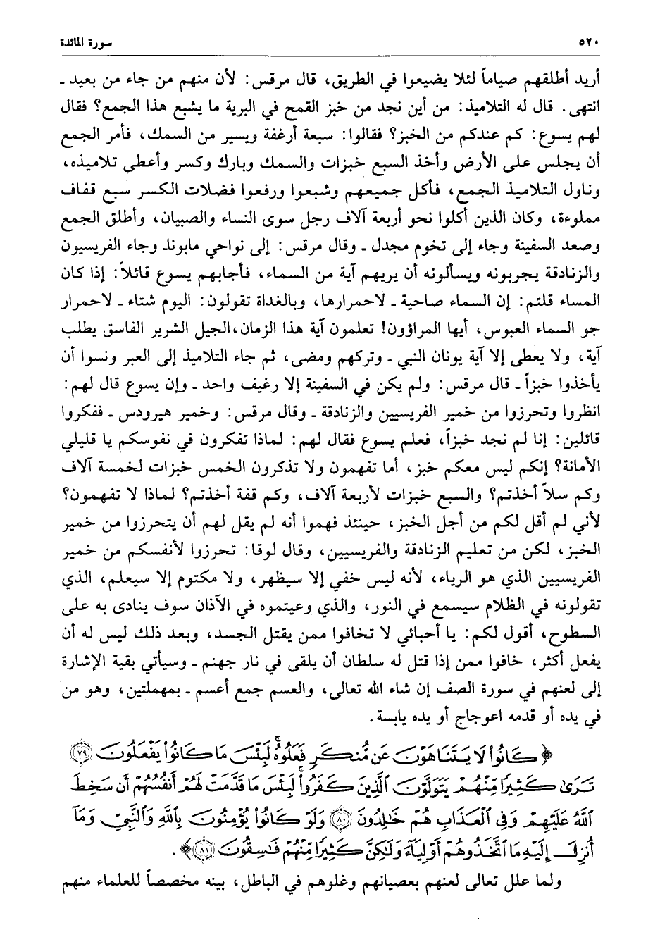 قال له التلاميذ : من أين نجد من خبز القمح في البرية ما يشبع هذا الجمع ؟ فقال لهم يسوع : كم عندكم من الخبز ؟ فقالوا : سبعة أرغفة ويسير من السمك ، فأمر الجمع أن يجلس على الأرض وأخذ السبع خبزات والسمك وبارك وكسر وأعطى تلاميذه ، وناول التلاميذ الجمع ، فأكل جميعهم وشبعوا ورفعوا فضلات الكسر سبع قفاف مملوءة ، وكان الذين أكلوا نحو أربعة آلاف رجل سوى النساء والصبيان ، وأطلق الجمع وصعد السفينة وجاء إلى تخوم مجدل - وقال مرقس : إلى نواحي مابونا - وجاء الفريسيون والزنادقة يجربونه ويسألونه أن يريهم آية من السماء ، فأجابهم يسوع قائلاً : إذا كان المساء قلتم : إن السماء صاحية - لاحمرارها ، وبالغداة تقولون : اليوم شتاء - لاحمرار جو المساء العبوس ، أيها المراؤون تعلمون آية هذا الزمان ، الجيل الشرير الفاسق يطلب آية ، ولا يعطى إلا آية يونان النبي - وتركهم ومضى ، ثم جاء التلاميذ إلى العبر ونسوا أن يأخذوا خبزاً - قال مرقس : ولم يكن في السفينة إلا رغيف واحد - وإن يسوع قال لهم : انظروا وتحرزوا من خمير الفريسيين والزنادقة - وقال مرقس : وخمير هيرودس - ففكروا قائلين : إنا لم نجد خبزاً ، فعلم يسوع فقال لهم : لماذا تفكرون في نفوسكم يا قليلي الأمانة ؟ إنكم ليس معكم خبز ، أما تفهمون ولا تذكرون الخمس خبزات لخمسة آلاف وكم سلاً أخذتم ؟ والسبع خبزات لأربعة آلاف ، وكم قفة أخذتم ؟ لماذا لا تفهمون ؟ لأني لم أقل لكم من أجل الخبز ، حينئذ فهموا أنه لم يقل لهم أن يتحرزوا من خمير الخبز ، لكن من تعليم الزنادقة والفريسيين ، وقال لوقا : تحرزوا لأنفسكم من خمير الفريسيين الذي هو الرياء ، لأنه ليس خفي إلا سيظهر ، ولا مكتوم إلا سيعلم ، الذي تقولونه في الظلام سيسمع في النور ، والذي وعيتموه في الآذان سوف ينادى به على السطوح ، أقول لكم : يا أحبائي لا تخافوا ممن يقتل الجسد ، وبعد ذلك ليس له أن يفعل أكثر ، خافوا ممن إذا قتل له سلطان أن يلقى في نار جهنم - وسيأتي بقية الإشارة إلى لعنهم في سورة الصف إن شاء الله تعالى ، والعسم جمع أعسم - بمهملتين ، وهو من في يده أو قدمه اعوجاج أو يده يابسة .