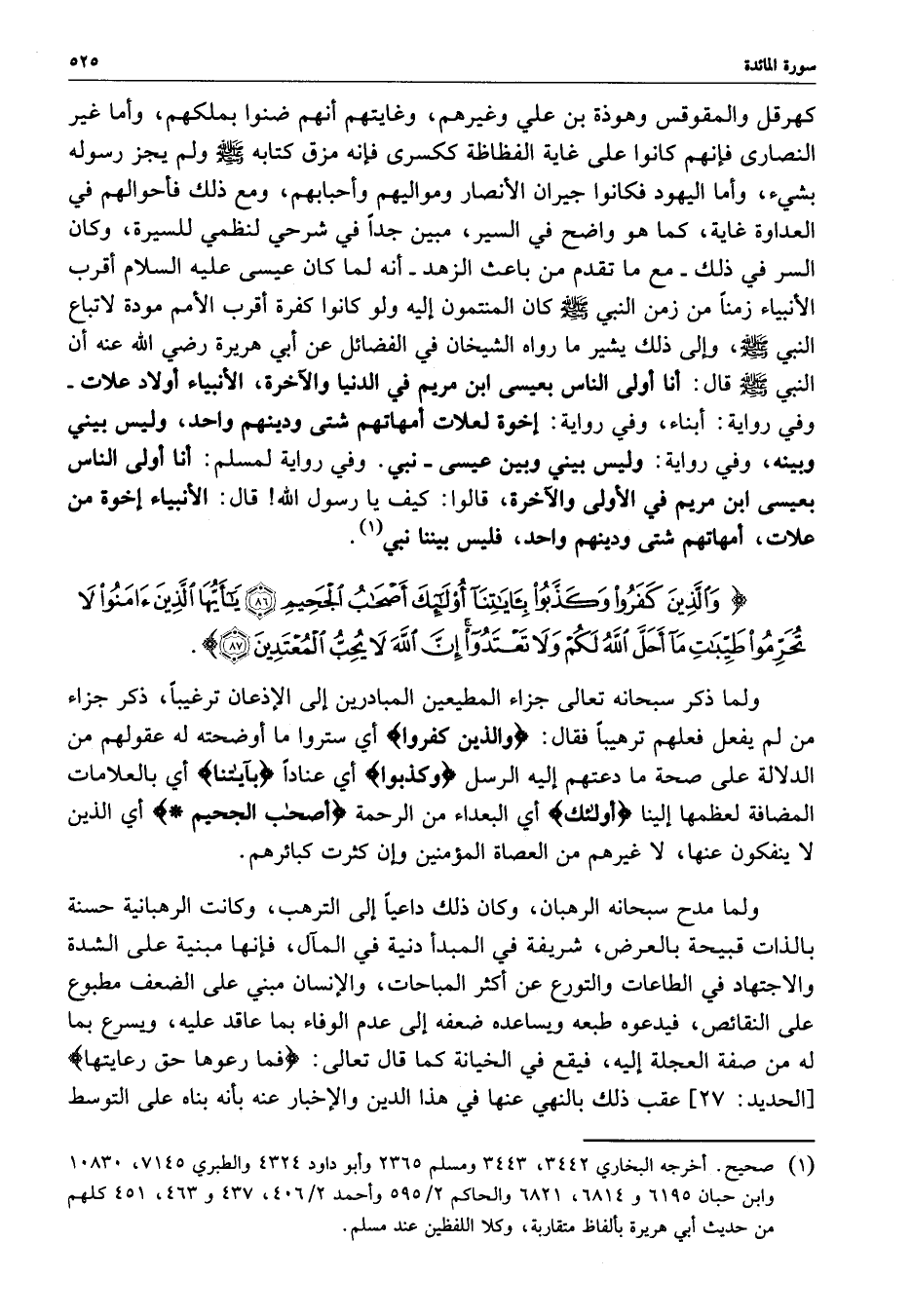 كهرقل والمقوقس وهوذة بن علي وغيرهم ، وغايتهم أنهم ضنوا بملكهم ، وأما غير النصارى فإنهم كانوا على غابة الفظاظة ككسرى فإنه مزق كتابه ( صلى الله عليه وسلم ) ولم يجز رسوله بشيء ، وأما اليهود فكانوا جيران الأنصار ومواليهم وأحبابهم ، ومع ذلك فأحوالهم في العداوة غاية ، كما هو واضح في السير ، مبين جداً في شرحي لنظمي للسيرة ، وكان السر في ذلك - مع ما تقدم من باعث الزهد - أنه لما كان عيسى عليه السلام أقرب الأنبياء زمناً من زمن النبي ( صلى الله عليه وسلم ) كان المنتمون إليه ولو كانوا كفرة أقرب الأمم مودة لاتباع النبي ( صلى الله عليه وسلم ) ، وإلى ذلك يشير ما رواه الشيخان في الفضائل عن أبي هريرة رضي الله عنه أن النبي ( صلى الله عليه وسلم ) قال : أنا أولى الناس بعيسى ابن مريم في الدنيا والآخرة ، الأنبياء أولاد علات - وفي رواية : أبناء ، وفي رواية : إخوة لعلات أمهاتهم شتى ودينهم واحد ، وليس بيني وبينه ، وفي رواية : وليس بيني وبين عيسى - نبي .