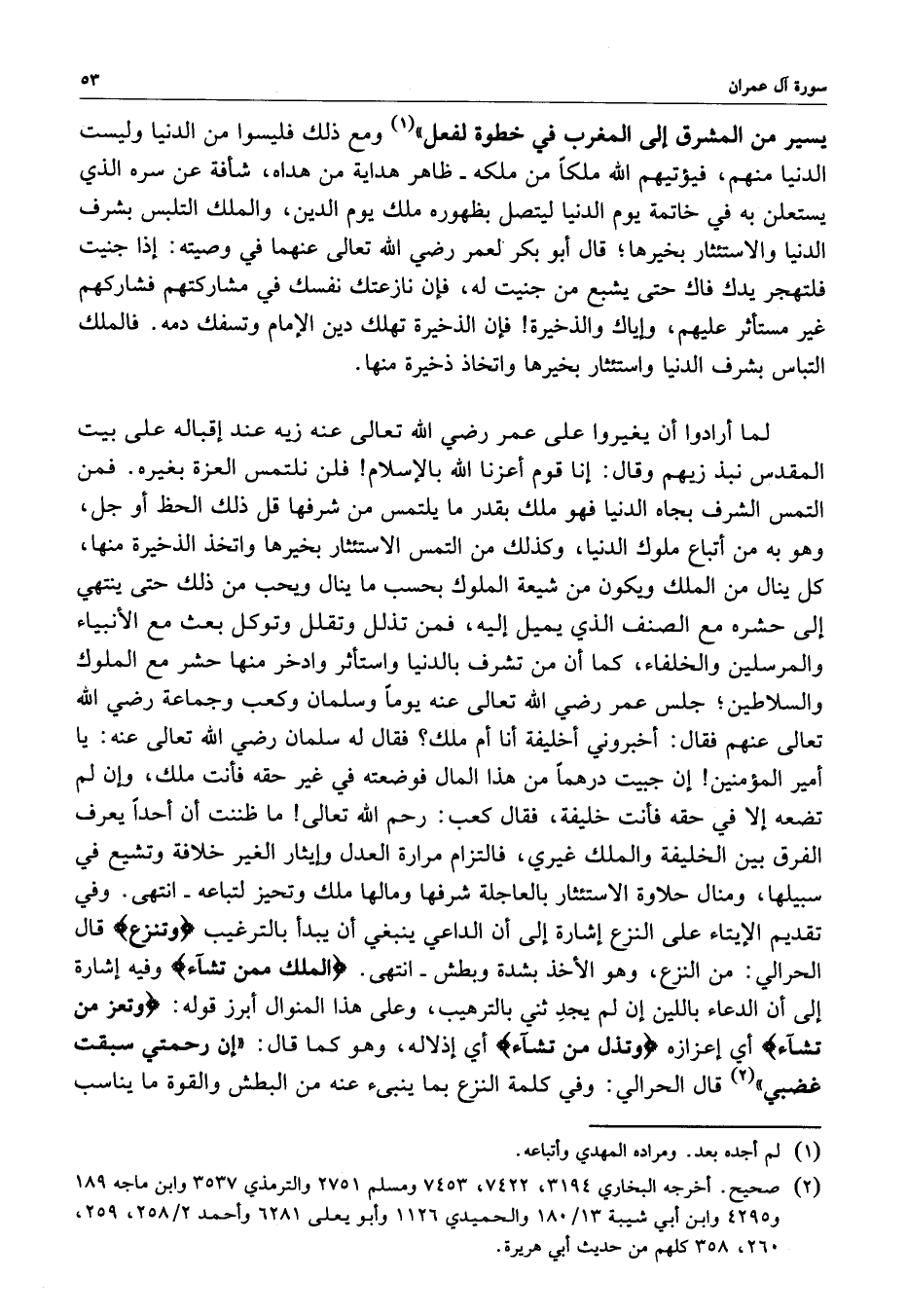 يسير من المشرق إلى المغرب في خطوة لفعل ) ومع ذلك فليسوا من الدنيا وليست الدنيا منهم ، فيؤتيهم الله ملكاً من ملكه - ظاهر هداية من هداه ، شأفة عن سره الذي يستعلن به في خاتمة يوم الدنيا ليتصل بظهوره ملك يوم الدين ، والملك التلبس بشرف الدنيا والاستئثار بخيرها ؛ قال أبو بكر لعمر رضي الله تعالى عنهما في وصيته : إذا جنيت فلتهجر يدلك فاك حتى يشبع من جنيت له ، فإن نازعتك نفسك في مشاركتهم فشاركهم غير مستأثر عليهم ، وإياك والذخيرة فإن الذخيرة تهلك دين الإمام وتسفك دمه ، فالملك التباس بشرف الدنيا واستئثار بخيرها واتخاذ ذخيرة منها .
