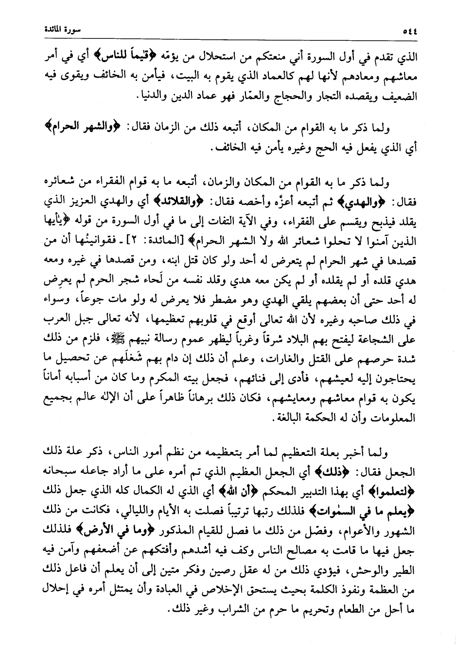 الذي تقدم في أول السورة أني منعتكم من استحلال من يؤمّه ) قياماً للناس ) أي في أمر معاشهم ومعادهم لأنها لهم كالعماد الذي يقوم به البيت ، فيأمن به الخائف ويقوى فيه الضعيف ويقصده التجار والحجاج والعمّار فهو عماد الدين والدنيا .