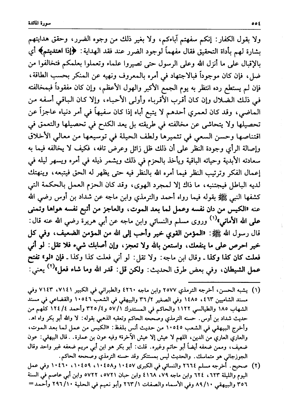 ولا بقول الكفار : إنكم سفهتم آراءكم ، ولا بغير ذلك من وجوه الضرر ، وحقق هدايتهم بشارة لهم بأداة التحقيق فقال مفهماً لوجود الضرر عند فقد الهداية : ( إذا اهتديتم ) أي بالإقبال على ما أنزل الله وعلى الرسول حتى تصيروا علماء وتعملوا بعلمكم فتخالفوا من ضل ، فإن كان موجوداً فبالاجتهاد في أمره بالمعروف ونهيه عن المنكر بحسب الطاقة ، فإن لم يستطع رده انتظر به يوم الجمع الأكبر والهول الأعظم ، وإن كان مفقوداً فبمخالفته في ذلك الضلال وإن كان أقرب الأقرباء وأولى الأحباء ، وإلا كان الباقي اسفه من الماضي ، وقد كان لعمري احدهم لا يتبع أباه إذا كان سفيهاً في أمر دنياه عاجزاً عن تحصيلها ولا يتحاشى عن مخالفته في طريقته بل يعد الكدح في تحصيلها والتعمق في اقتناصها وحسن السعي في تثميرها ولطف الحيلة في توسيعها من معالي الأخلاق وإصالة الرأي وجودة النظر على أن ذلك ظل زائل وعرض تافه ، فكيف لا يخالفه فيما به سعادته الأبدية وحياته الباقية ويأخذ بالحزم في ذلك ويشمر ذيله في أمره ويسهر ليله في إعمال الفكر وترتيب النظر فيما أمره الله بالنظر فيه حتى يظهر له الحق فيتبعه ، وينهتك لديه الباطل فيجتنبه ، ما ذاك إلا لمجرد الهوى ، وقد كان الحزم العمل بالحكمة التي كشفها النبي ( صلى الله عليه وسلم ) بقوله فيما رواه أحمد والترمذي وابن ماجه عن شداد بن أوس رضي الله عنه ( الكيس من دان نفسه وعمل لما بعد الموت ، والعاجز من أتبع نفسه هواها وتمنى على الله الأماني ) وروى مسلم والنسائي وابن ماجه عن أبي هريرة رضي الله عنه قال : قال رسول الله ( صلى الله عليه وسلم ) : ( المؤمن القوي خير وأحب إلى الله من المؤمن الضعيف ، وفي كل خير أحرص على ما ينفعك ، واستعن بالله ولا تعجز ، وإن أصابك شيء فلا تقل : لو أني فعلت كان كذا وكذا - وقال ابن ماجه : ولا تقل : لو أني فعلت كذا وكذا - فإن ) لو ( تفتح عمل الشيطان ) ، وفي بعض طرق الحديث : ( ولكن قل : قدر الله وما شاء فعل ) يعني :
