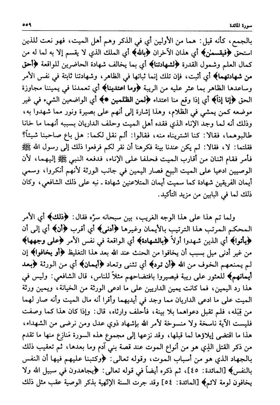 ولما تم هذا على هذا الوجه الغريب ، بين سبحانه سرَّه فقال : ( ذلك ) أي الأمر المحكم المرتب هذا الترتيب بالأيمان وغيرها ) أدنى ) أي أقرب ) أن ) أي إلى أن ) يأتوا ) أي الذين شهدوا أولاً ) بالشهادة ) أي الواقعة في نفس الأمر ) على وجهها ( من غير أدنى ميل بسبب أن يخافوا من الحنث عند الله بعد هذا التغليظ ) أو يخافوا ( إن لم يمنعهم الخوف من الله ) أن ترد ) أي تثنى وتعاد ) أيمان ) أي من الورثة ) بعد أيمانهم ( للعثور على ريبة فيصيروا بافتضاحهم مثلاً للناس ، قال الشافعي : وليس في هذا رد اليمين ، فما كانت يمين الداريين على ما ادعى الورثة من الخيانة ، ويمين ورثة الميت على ما ادعى الداريان مما وجد في أيديهما وأقرا أنه مال الميت وأنه صار لهما من قِبَله ، فلم تقبل دعواهما بلا بينة ، فأحلف وارثاه ، قال : وإذا كان هذا كما وصفت فليست الآية ناسخة ولا منسوخة لأمر الله بإشهاد ذوي عدل ومن نرضى من الشهداء ، هذا ما اقتضى إيلاؤها لما قبلها ، وقد نزعها إلى مجموع هذه السورة مَنازع منها ما تقدم من ذكر القتل الذي هو من أنواع الموت عند قصة بني آدم وما بعدها ، ثم تعقيب ذلك بالجهاد الذي هو من أسباب الموت ، وقوله تعالى :