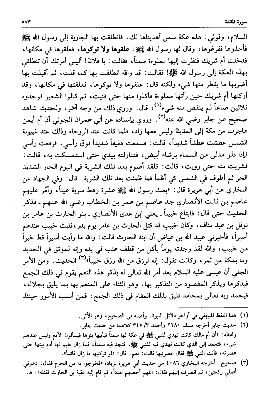 قال : وفي الجهاد عن البخاري عن أبي هريرة قال : ( بعث رسول الله ( صلى الله عليه وسلم ) عشرة رهط سرية عيناً ، وأمَّر عليهم عاصم بن ثابت الأنصاري جد عاصم بن عمر بن الخطاب رضي الله عنهم - فذكر الحديث حتى قال : فابتاع خبيباً - يعني ابن عدي الأنصاري - بنو الحارث بن عامر بن نوفل بن عبد مناف ، وكان خبيب قد قتل الحارث بن عامر يوم بدر ، فلبث خبيب عندهم أسيراً ، فأخبرني عبيد الله بن عياض أن ابنة الحارث قالت : والله ما رأيت أسيراً قط خيراً من خبيب ، والله لقد وجدته يوماً ياكل من قطف عنب في يده وإنه لموثق في الحديد وما بمكة من ثمر ، وكانت تقول : إنه لرزق من الله رزق خبيباً ) الحديث .