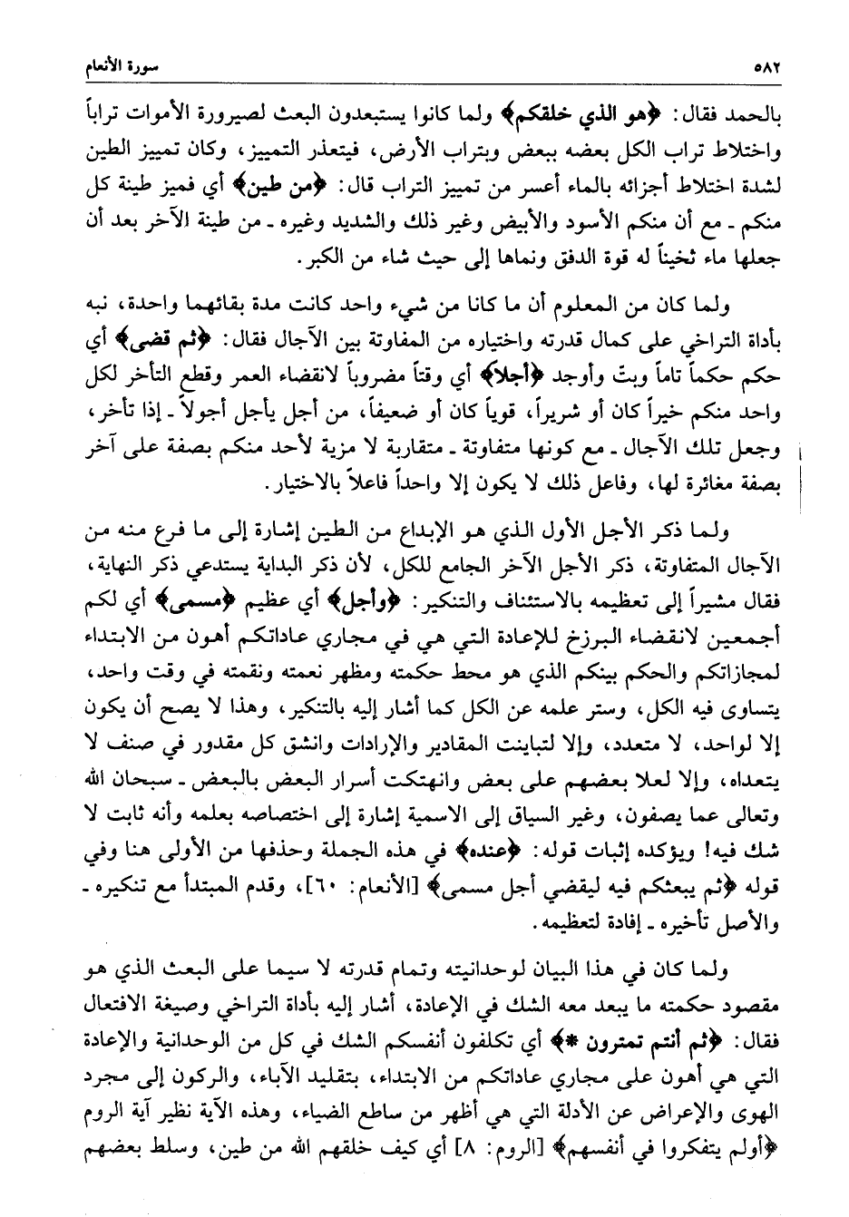 ولما ذكر الأجل الأول الذي هو الإبداع من الطين إشارة إلى ما فرع منه من الآجال المتفاوتة ، ذكر الأجل الآخر الجامع للكل ، لأن ذكر البداية يستدعي ذكر النهاية ، فقال مشيراً إلى تعظيمه بالاستئناف والتنكير : ( وأجل ) أي عظيم ) مسمى ) أي لكم أجمعين لانقضاء البرزخ للإعادة التي هي في مجاري عاداتكم أهون من الابتداء لمجازاتكم والحكم بينكم الذي هو محط حكمته ومظهر نعمته ونقمته في وقت واحد ، يتساوى فيه الكل ، وستر علمه عن الكل كما أشار إليه بالتنكير ، وهذا لا يصح أن يكون إلا لواحد ، لا متعدد ، وإلا لتباينت المقادير والإرادات وانشق كل مقدور في صنف لا يتعداه ، وإلا لعلا بعضهم على بعض وانهتكت أسرار البعض بالبعض - سبحان الله وتعالى عما يصفون ، وغير السياق إلى الاسمية إشارة إلى اختصاصه بعلمه وأنه ثابت لا شك فيه ويؤكده إثبات قوله : ( عنده ( في هذه الجملة وحذفها من الأولى هنا وفي قوله
