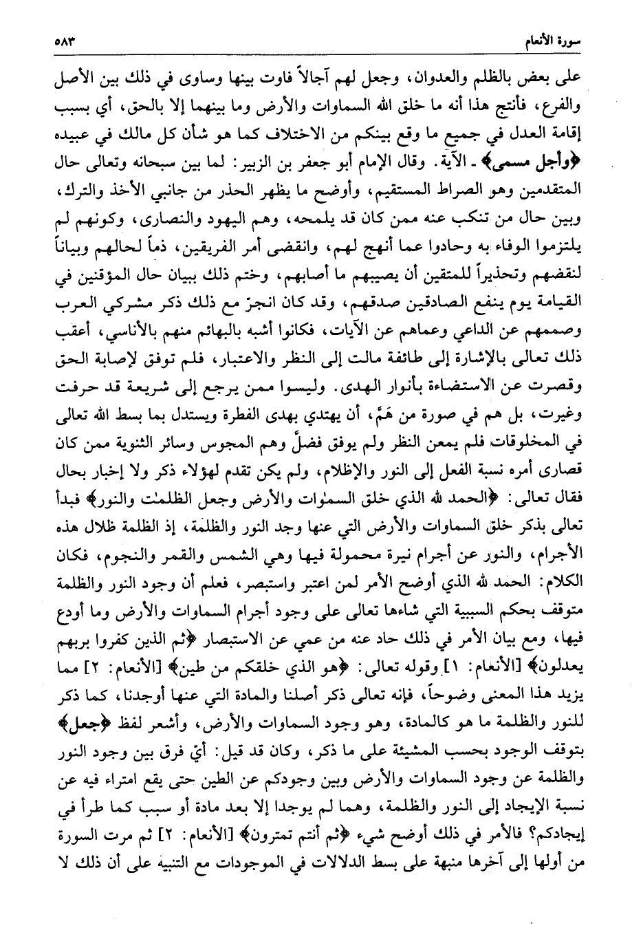 وليسوا ممن يرجع إلى شريعة قد حرفت وغيرت ، بل هم في صورة من هَمَّ ، أن يهتدي بهدى الفطرة ويستدل بما بسط الله تعالى في المخلوقات فلم يمعن النظر ولم يوفق فضلَّ وهم المجوس وسائر الثنوية ممن كان قصارى أمره نسبة الفعل إلى النور والإظلام ، ولم يكن تقدم لهؤلاء ذكر ولا إخبار بحال فقال تعالى : ( الحمد لله الذي خلق السماوات والأرض وجعل الظلمات والنور ( فبدأ تعالى بذكر خلق السماوات والأرض التي عنها وجد النور والظلمة ، إذ الظلمة ظلال هذه الأجرام ، والنور عن أجرام نيرة محمولة فيها وهي الشمس والقمر والنجوم ، فكان الكلام : الحمد لله الذي أوضح الأمر لمن اعتبر واستبصر ، فعلم أن وجود النور والظلمة متوقف بحكم السببية التي شاءها تعالى على وجود أجرام السماوات والأرض وما أودع فيها ، ومع بيان الأمر في ذلك حاد عنه من عمي عن الاستبصار