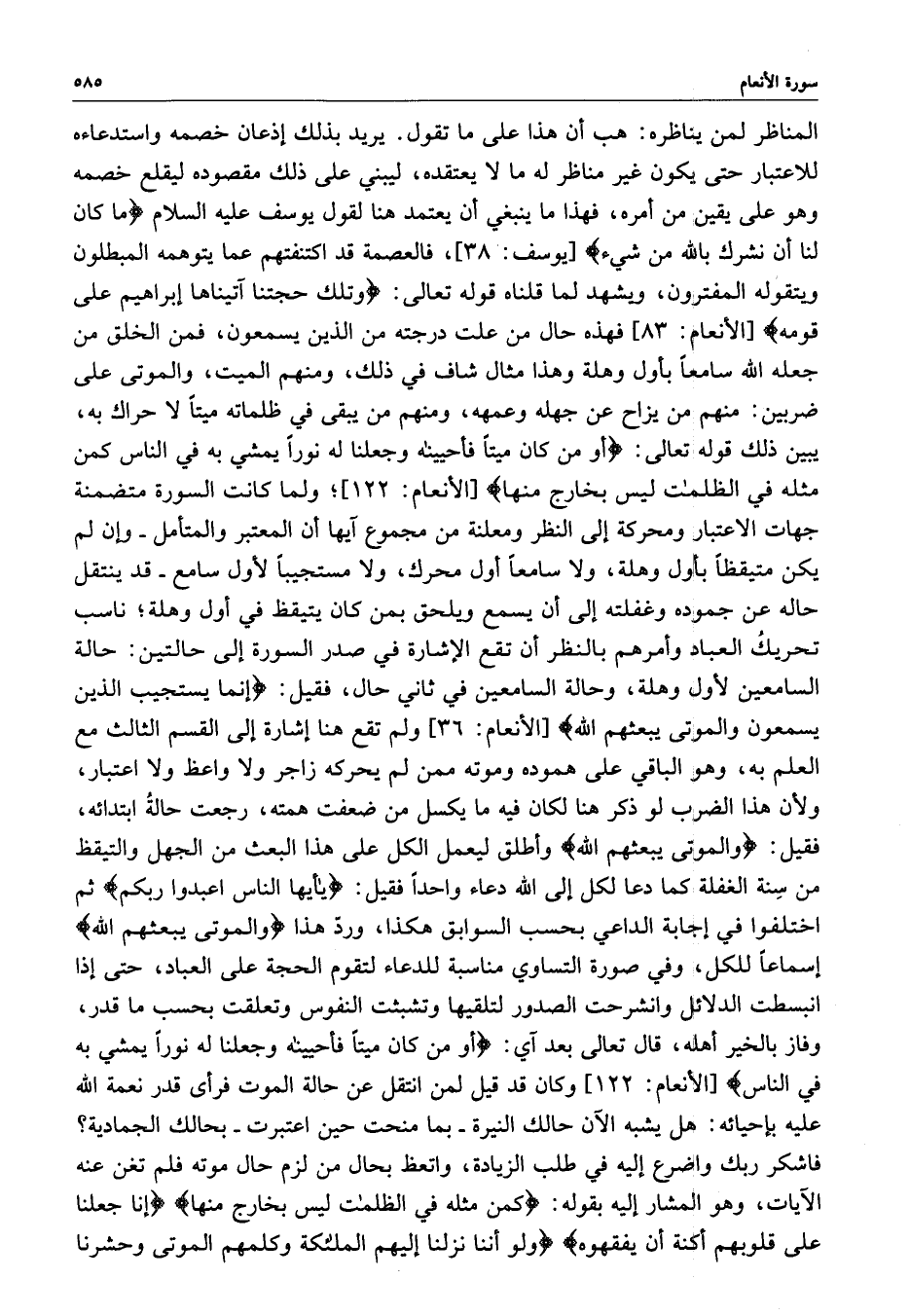 [ الأنعام : 122 ] ؛ ولما كانت السورة متضمنة جهات الاعتبار ومحركة إلى النظر ومعلنة من مجموع آيها أن المعتبر والمتأمل - وإن لم يكن متيقظاً بأول وهلة ، ولا سامعاً أول محرك ، ولا مستجيباً لأول سامع - قد ينتقل حاله عن جموده وغفلته إلى أن يسمع ويلحق بمن كان يتيقظ في أول وهلة ؛ ناسب تحريكُ العباد وأمرهم بالنظر أن تقع الإشارة في صدر السورة إلى حالتين : حالة السامعين لأول وهلة ، وحالة السامعين في ثاني حال ، فقيل :