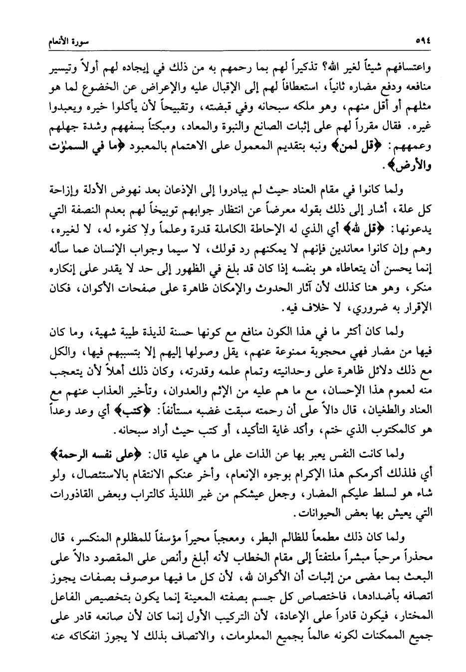 واعتسافهم شيئاً لغير الله ؟ تذكيراً لهم بما رحمهم به من ذلك في إيجاده لهم أولاً وتيسير منافعه ودفع مضاره ثانياً ، استعطافاً لهم إلى الإقبال عليه والإعراض عن الخضوع لما هو مثلهم أو أقل منهم ، وهو ملكه سبحانه وفي قبضته ، وتقبيحاً لأن يأكلوا خيره ويعبدوا غيره .