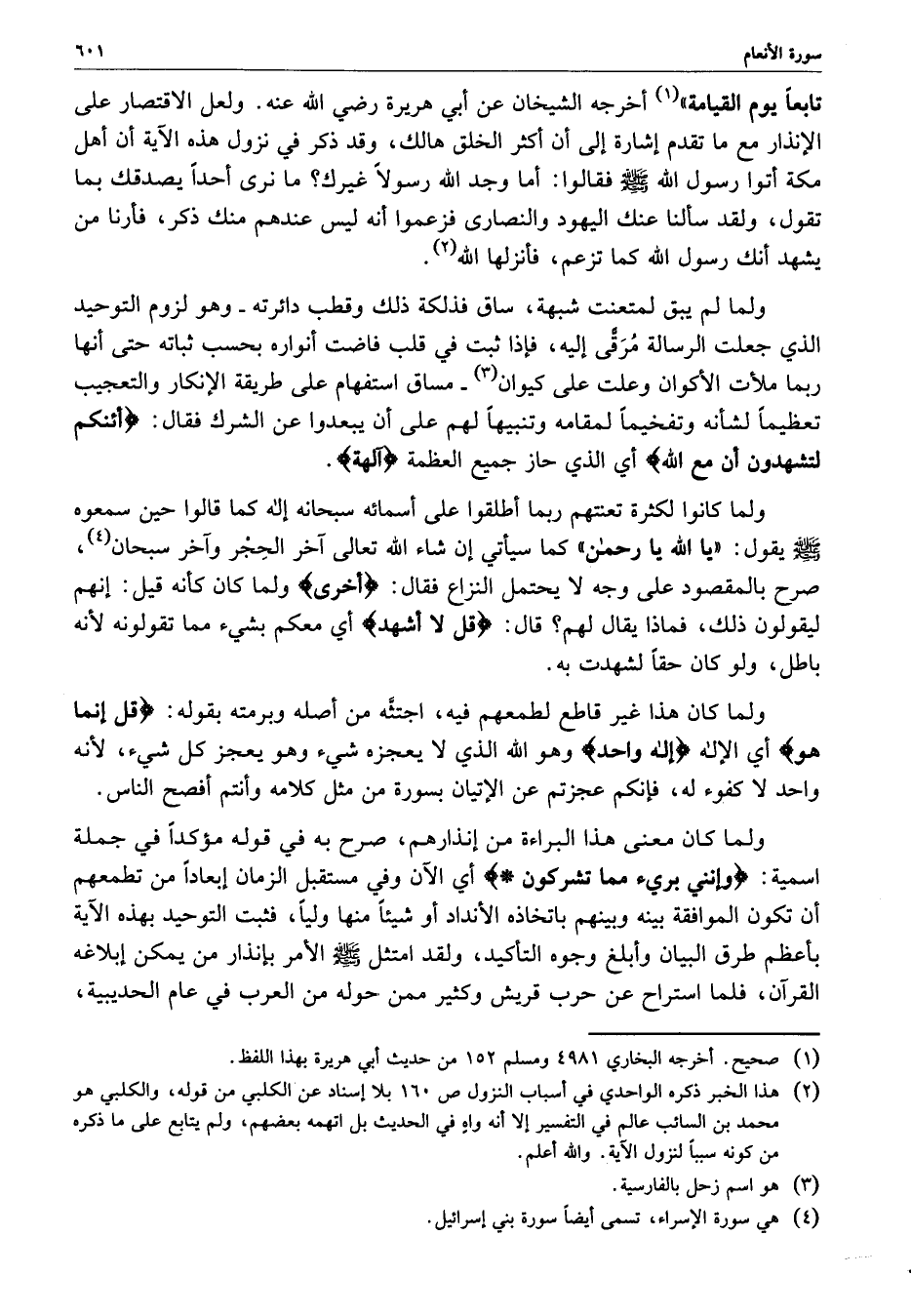 ولعل الاقتصار على الإنذار مع ما تقدم إشارة إلى أن أكثر الخلق هالك ، وقد ذكر في نزول هذه الآية أن أهل مكة أتوا رسول الله ( صلى الله عليه وسلم ) فقالوا : أما وجد الله رسولاً غيرك ؟ ما نرى أحداً يصدقك بما تقول ، ولقد سألنا عنك اليهود والنصارى فزعموا أنه ليس عندهم منك ذكر ، فأرنا من يشهد أنك رسول الله كما تزعم ، فأنزلها الله .