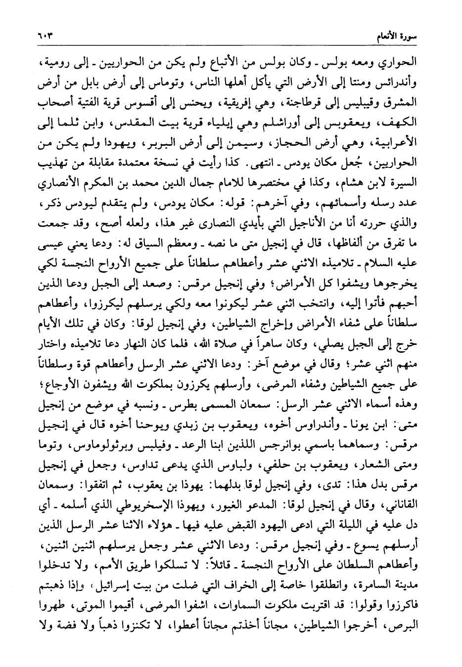 كذا رأيت في نسخة معتمدة مقابلة من تهذيب السيرة لابن هشام ، وكذا في مختصرها للامام جمال الدين محمد بن المكرم الأنصاري عدد رسله وأسمائهم ، وفي أخرهم : قوله : مكان يودس ، ولم يتقدم ليودس ذكر ، والذي حررته أنا من الأناجيل التي بأيدي النصارى غير هذا ، ولعله أصح ، وقد جمعت ما تفرق من ألفاظها ، قال في إنجيل متى ما نصه - ومعظم السياق له : ودعا يعني عيسى عليه السلام - تلاميذه الاثني عشر وأعطاهم سلطاناً على جميع الأرواح النجسة لكي يخرجوها ويشفوا كل الأمراض ؛ وفي أنجيل مرقس : وصعد إلى الجبل ودعا الذين أحبهم فأتوا إليه ، وانتخب اثني عشر ليكونوا معه ولكي يرسلهم ليكرزوا ، وأعطاهم سلطاناً على شفاء الأمراض وإخراج الشياطين ، وفي إنجيل لوقا : وكان في تلك الأيام خرج إلى الجبل يصلي ، وكان ساهراً في صلاة الله ، فلما كان النهار دعا تلاميذه واختار منهم اثني عشر ؛ وقال في موضع آخر : ودعا الاثني عشر الرسل وأعطاهم قوة وسلطاناً على جميع الشياطين وشفاء المرضى ، وأرسلهم يكرزون بملكوت الله ويشفون الأوجاع ؛ وهذه أسماء الاثني عشر الرسل : سمعان المسمى بطرس - ونسبه في موضع من إنجيل متى : ابن يونا - وأندراوس أخوه ، ويعقوب بن زبدي ويوحنا أخوه قال في إنجيل مرقس : وسماهما باسمي بوانرجس اللذين ابنا الرعد - وفيلبس وبرثولوماوس ، وتوما ومتى الشعار ، ويعقوب بن حلفي ، ولباوس الذي يدعى تداوس ، وجعل في إنجيل مرقس بدل هذا : تدى ، وفي إنجيل لوقا بدلهما : يهوذا بن يعقوب ، ثم اتفقوا : وسمعان القاناني ، وقال في إنجيل لوقا : المدعو الغيور ، ويهوذا الإسخريوطي الذي أسلمه - أي دل عليه في الليلة التي ادعى اليهود القبض عليه فيها - هؤلاء الاثنا عشر الرسل الذين أرسلهم يسوع - وفي إنجيل مرقس : ودعا الاثني عشر وجعل يرسلهم اثنين اثنين ، وأعطاهم السلطان على الأرواح النجسة - قائلاً : لا تسلكوا طريق الأمم ، ولا تدخلوا مدينة السامرة ، وانطلقوا خاصة إلى الخراف التي ضلت من بيت إسرائيل ، وإذا ذهبتم فاكرزوا وقولوأ : قد اقتربت ملكوت السماوات ، اشفوا المرضى ، أقيموا الموتى ، طهروا البرص ، أخرجوا الشياطين ، مجاناً أخذتم مجاناً أعطوا ، لا تكنزوا ذهباً ولا فضة ولا