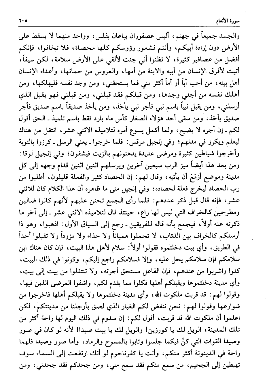 والجسد جميعاً في جهنم ، أليس عصفوران يباعان بفلس ، وواحد منهما لا يسقط على الأرض دون إرادة أبيكم ، وأنتم فشعور رؤوسكم كلها محصاة ، فلا تخافوا ، فإنكم أفضل من عصافير كثيرة ، لا تظنوا أني جئت لألقي على الأرض سلامة ، لكن سيفاً ، أتيت لأفرق الإنسان من أبيه والابنة من أمها ، والعروس من حماتها ، وأعداء الإنسان أهل بيته ، من أحب أباً أو أماً أكثر مني فما يستحقني ، ومن وجد نفسه فليهلكها ، ومن أهلك نفسه من أجلي وجدها ، ومن قبلكم فقد قبلني ، ومن قبلني فهو يقبل الذي أرسلني ، ومن يقبل نبياً باسم نبي فأجر نبي يأخذ ، ومن يأخذ صديقاً باسم صديق فأجر صديق يأخذ ، ومن سقى أحد هؤلاء الصغار كأس ماء بارد فقط باسم تلميذ - الحق أقول لكم - إن أجره لا يضيع ، ولما أكمل يسوع أمره لتلاميذه الاثني عشر ، انتقل من هناك ليعلم ويكرز في مدنهم ؛ وفي إنجيل مرقس : فلما خرجوا - يعني الرسل - كرزوا بالتوبة وأخرجوا شياطين كثيرة ومرضى عديدة يدهنونهم بالزيت فيشفون ؛ وفي إنجيل لوقا : ومن بعد هذا أيضاً ميز الرب سبعين آخرين ويرسلهم اثنين اثنين قدام وجهه إلى كل مدينة وموضع أزمَعَ أن يأتيه ، وقال لهم : إن الخصاد كثير والفعلة فليلون ، أطلبوا من رب الحصاد ليخرج فعلة لحصاده ؛ وفي إنجيل متى ما ظاهره أن هذا الكلام كان للاثني عشر ، فإنه قال قبل ذكر عددهم : فلما رأى الجمع تحنن عليهم لأنهم كانوا ضالين ومطرحين كالخراف التي ليس لها راع ، حينئذ قال لتلاميذه الاثني عشر - إلى آخر ما ذكرته عنه أولاً ، فيجمع بأنه قاله للفريقين - رجع إلى السياق الأول : اذهبوا ، وهو ذا أرسلكم كالخراف بين الذئاب ، لا تحملوا همياناً ولا حذاء ولا مزوداً ولا تقبلوا أحداً في الطريق ، وأي بيت دخلتموه فقولوا أولاً : سلام لأهل هذا البيت ، فإن كان هناك ابن سلامكم فإن سلامكم يحل عليه ، وإلا فسلامكم راجع إليكم ، وكونوا في ذلك البيت ، كلوا واشربوا من عندهم ، فإن الفاعل مستحق أجرته ، ولا تنتقلوا من بيت إلى بيت ، وأي مدينة دخلتموها ويقبلكم أهلها فكلوا مما يقدم لكم ، واشفوا المرضى الذين فيها ، وقولوا لهم : قد قربت ملكوت الله ، وأي مدينة دخلتموها ولا يقبلكم أهلها فاخرجوا من شوارعها وقولوا لهم : نحن ننفض لكم الغبار الذي لصق بأرجلنا من مدينتكم ، لكن اعلموا أن ملكوت الله قد قربت ، أقول لكم : إن سدوم في ذلك اليوم لها راحة أكثر من تلك المدينة ، الويل لك يا كورزين والويل لك يا بيت صيدا لأنه لو كان في صور وصيدا القوات التي كنَّ فيكما جلسوا وتابوا بالمسوح والرماد ، وأما صور وصيدا فلهما راحة في الدينونة أكثر منكم ، وأنت يا كفرناحوم لو أنك ارتفعت إلى السماء سوف تهبطين إلى الجحيم ، من سمع منكم فقد سمع مني ، ومن جحدكم فقد جحدني ، ومن