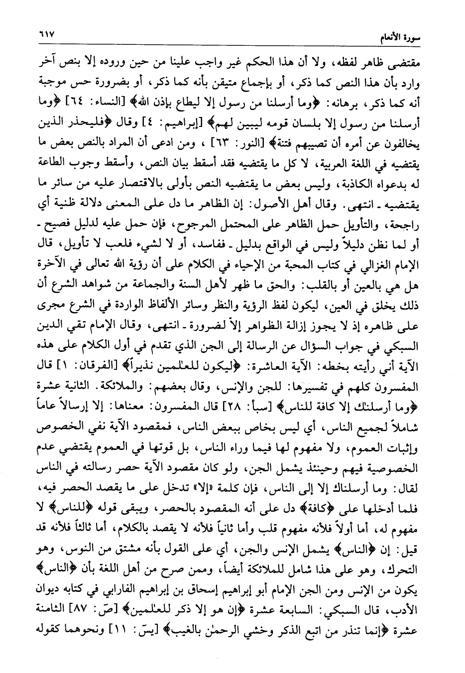 [ سبأ : 28 ] قال المفسرون : معناها : إلا إرسالاً عاماً شاملاً لجميع الناس ، أي ليس بخاص ببعض الناس ، فمقصود الآية نفي الخصوص وإثبات العموم ، ولا مفهوم لها فيما وراء الناس ، بل قوتها في العموم يقتضي عدم الخصوصية فيهم وحينئذ يشمل الجن ، ولو كان مقصود الآية حصر رسالته في الناس لقال : وما أرسلناك إلا إلى الناس ، فإن كلمة ( إلا ) تدخل على ما يقصد الحصر فيه ، فلما أدخلها على ) كافة ( دل على أنه المقصود بالحصر ، ويبقى قوله ) للناس ( لا مفهوم له ، أما أولاً فلأنه مفهوم قلب وأما ثانياً فلأنه لا يقصد بالكلام ، أما ثالثاً فلأنه قد قيل : إن ) الناس ( يشمل الإنس والجن ، أي على القول بأنه مشتق من النوس ، وهو التحرك ، وهو على هذا شامل للملائكة أيضاً ، وممن صرح من أهل اللغة بأن ) الناس ( يكون من الإنس ومن الجن الإمام أبو إبراهيم إسحاق بن إبراهيم الفارابي في كتابه ديوان الأدب ، قال السبكي : السابعة عشرة