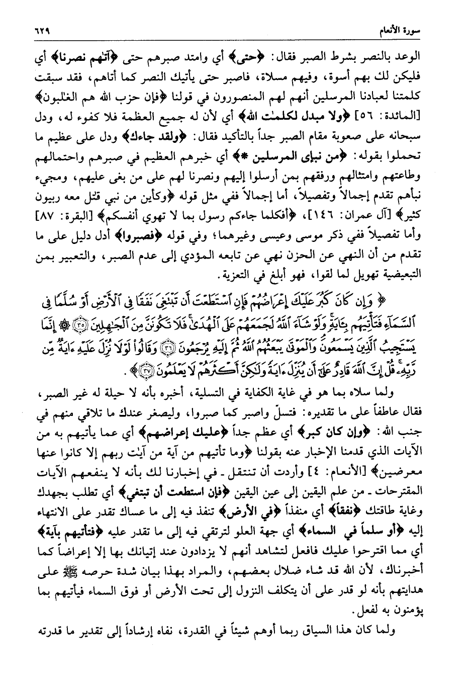 ) وَإِن كَانَ كَبُرَ عَلَيْكَ إِعْرَاضُهُمْ فَإِن اسْتَطَعْتَ أَن تَبْتَغِيَ نَفَقاً فِي الأَرْضِ أَوْ سُلَّماً فِي السَّمَآءِ فَتَأْتِيَهُمْ بِآيَةٍ وَلَوْ شَآءَ اللَّهُ لَجَمَعَهُمْ عَلَى الْهُدَى فَلاَ تَكُونَنَّ مِنَ الْجَاهِلِينَ إِنَّمَا يَسْتَجِيبُ الَّذِينَ يَسْمَعُونَ وَالْمَوْتَى يَبْعَثُهُمُ اللَّهُ ثُمَّ إِلَيْهِ يُرْجَعُونَ وَقَالُواْ لَوْلاَ نُزِّلَ عَلَيْهِ آيَةٌ مِّن رَّبِّهِ قُلْ إِنَّ اللَّهَ قَادِرٌ عَلَى أَن يُنَزِّلٍ آيَةً وَلَكِنَّ أَكْثَرَهُمْ لاَ يَعْلَمُونَ ( ( )