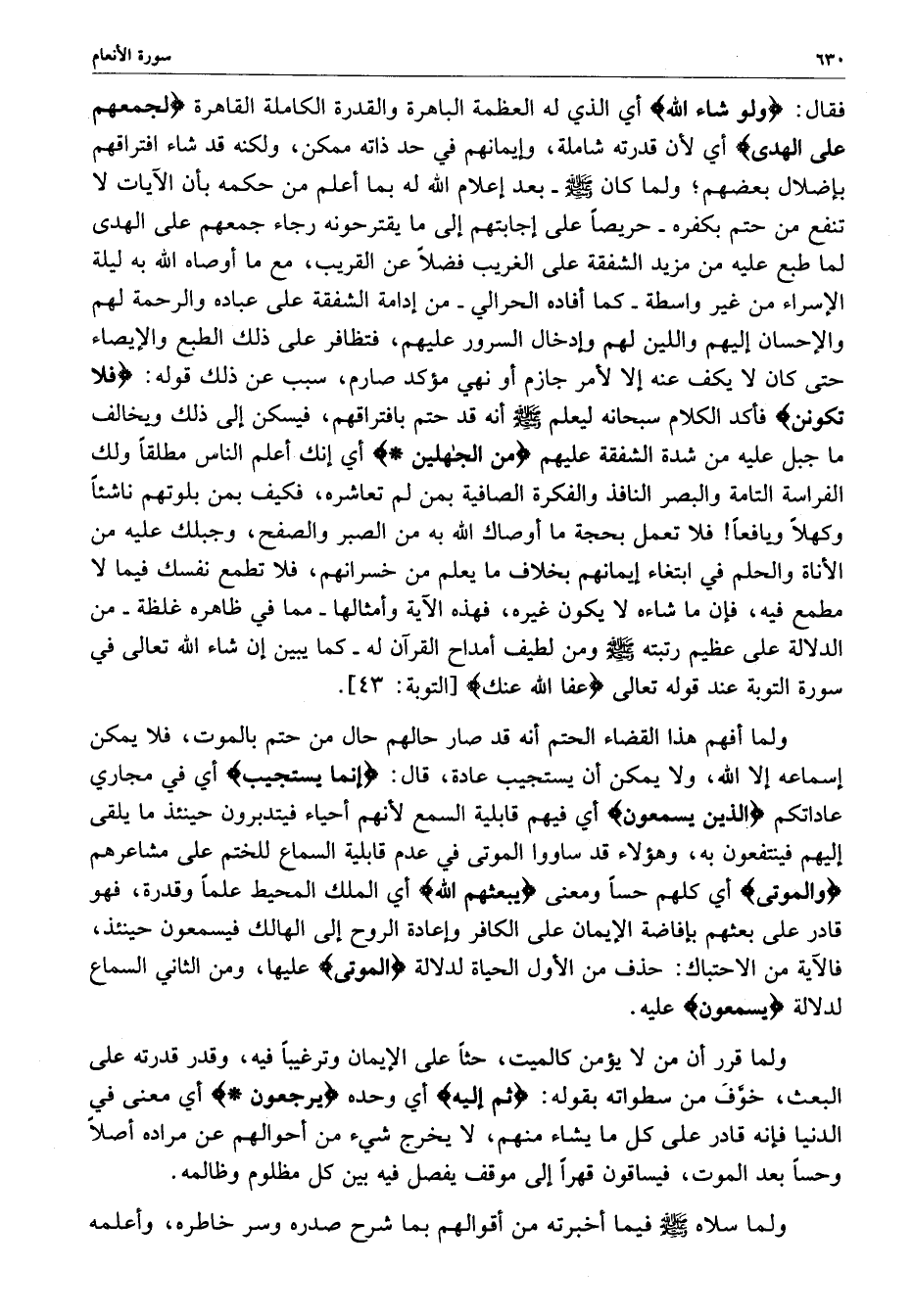 فقال : ( ولو شاء الله ) أي الذي له العظمة الباهرة والقدرة الكاملة القاهرة ) لجمعهم على الهدى ) أي لأن قدرته شاملة ، وإيمانهم في حد ذاته ممكن ، ولكنه قد شاء افتقراقهم بإضلال بعضهم ؛ ولما كان ( صلى الله عليه وسلم ) - بعد إعلام الله له بما أعلم من حكمه بأن الآيات لا تنفع من حتم بكفره - حريصاً على إجابتهم إلى ما يقترحونه رجاء جمعهم على الهدى لما طبع عليه من مزيد الشفقة على الغريب فضلاً عن القريب ، مع ما أوصاه الله به ليلة الإسراء من غير واسطة - كما أفاده الحرالي - من إدامة الشفقة على عباده والرحمة لهم والإحسان إليهم واللين لهم وإدخال السرور عليهم ، فتظافر على ذلك الطبع والإيصاء حتى كان لا يكف عنه إلا لأمر جازم أو نهي مؤكد صارم ، سبب عن ذلك قوله : ( فلا تكونن ( فأكد الكلام سبحانه ليعلم ( صلى الله عليه وسلم ) أنه قد حتم بافتراقهم ، فيسكن إلى ذلك ويخالف ما جبل عليه من شدة الشفقة عليهم ) من الجاهلين ) أي إنك أعلم الناس مطلقاً ولك الفراسة التامة والبصر النافذ والفكرة الصافية بمن لم تعاشره ، فكيف بمن بلوتهم ناشئاً وكهلاً ويافعاً فلا تعمل بحجة ما أوصاك الله به من الصبر والصفح ، وجبلك عليه من الأناة والحلم في ابتغاء إيمانهم بخلاف ما يعلم من خسرانهم ، فلا تطمع نفسك فيما لا مطمع فيه ، فإن ما شاءه لا يكون غيره ، فهذه الآية وأمثالها - مما في ظاهره غلظة - من الدلالة على عظيم رتبته ( صلى الله عليه وسلم ) ومن لطيف أمداح القرآن له - كما يبين إن شاء الله تعالى في سورة التوبة عند قوله تعالى
