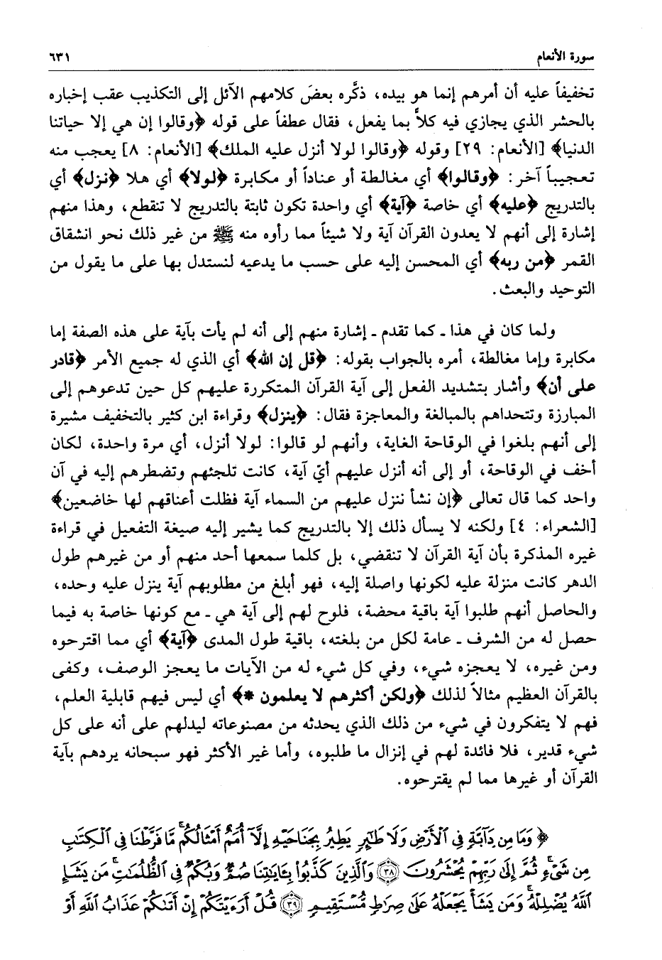 ) وَمَا مِن دَآبَّةٍ فِي الأَرْضِ وَلاَ طَائِرٍ يَطِيرُ بِجَنَاحَيْهِ إِلاَّ أُمَمٌ أَمْثَالُكُمْ مَّا فَرَّطْنَا فِي الكِتَابِ مِن شَيْءٍ ثُمَّ إِلَى رَبِّهِمْ يُحْشَرُونَ وَالَّذِينَ كَذَّبُواْ بِآيَاتِنَا صُمٌّ وَبُكْمٌ فِي الظُّلُمَاتِ مَن يَشَإِ اللَّهُ يُضْلِلْهُ وَمَن يَشَأْ يَجْعَلْهُ عَلَى صِرَاطٍ مُّسْتَقِيمٍ قُلْ أَرَأَيْتُكُم إِنْ أَتَاكُمْ عَذَابُ اللَّهِ أَوْ أَتَتْكُمْ