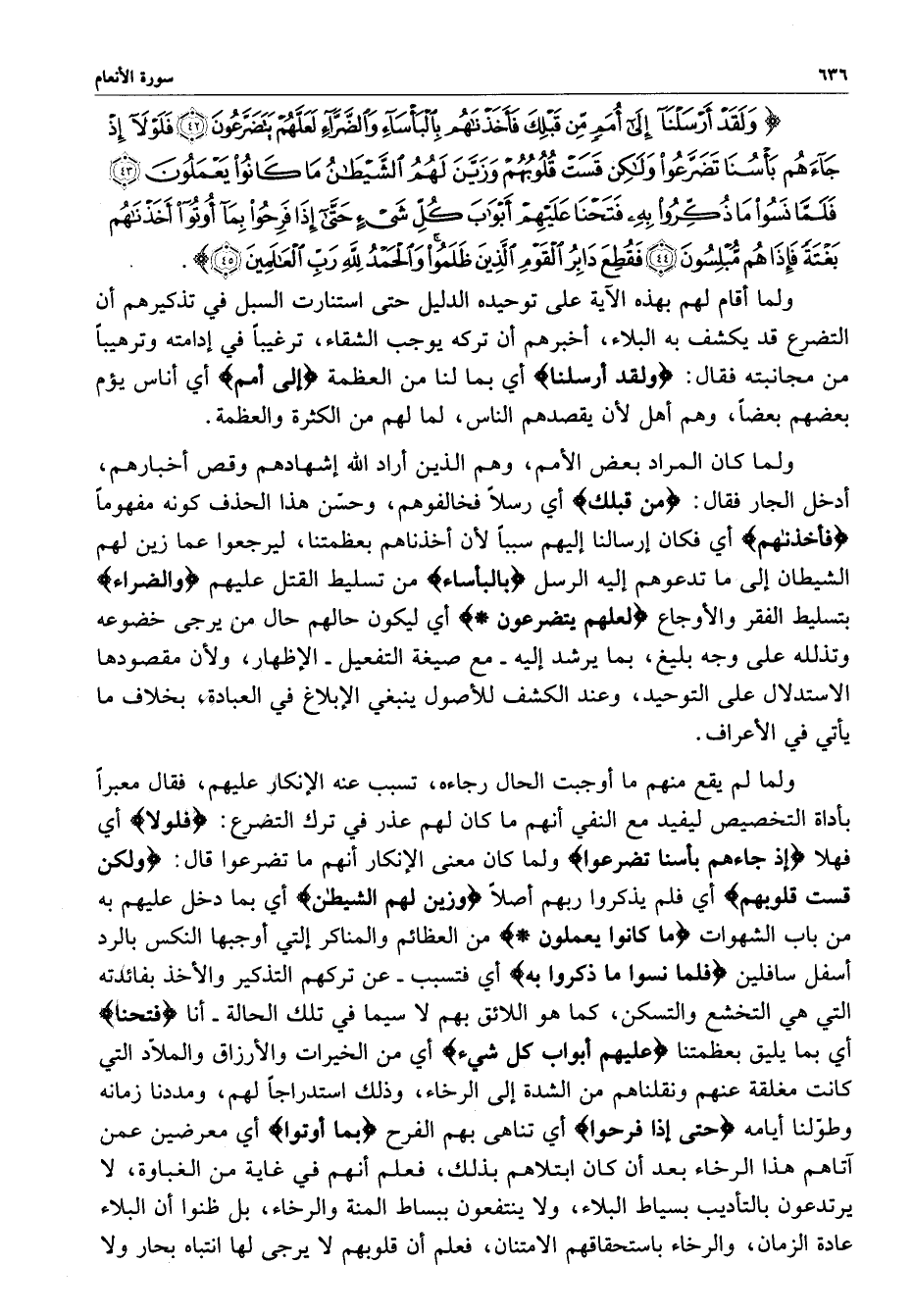 ) وَلَقَدْ أَرْسَلنَآ إِلَى أُمَمٍ مِّن قَبْلِكَ فَأَخَذْنَاهُمْ بِالْبَأْسَآءِ وَالضَّرَّآءِ لَعَلَّهُمْ يَتَضَرَّعُونَ فَلَوْلا إِذْ جَآءَهُمْ بَأْسُنَا تَضَرَّعُواْ وَلَكِن قَسَتْ قُلُوبُهُمْ وَزَيَّنَ لَهُمُ الشَّيْطَانُ مَا كَانُواّ يَعْمَلُونَ فَلَمَّا نَسُواْ مَا ذُكِّرُواْ بِهِ فَتَحْنَا عَلَيْهِمْ أَبْوَابَ كُلِّ شَيْءٍ حَتَّى إِذَا فَرِحُواْ بِمَآ أُوتُواْ أَخَذْنَاهُمْ بَغْتَةً فَإًّذَا هُمْ مُّبْلِسُونَ فَقُطِعَ دَابِرُ الْقَوْمِ الَّذِينَ ظَلَمُواْ وَالْحَمْدُ للَّهِ رَبِّ الْعَالَمِينَ ( ( )