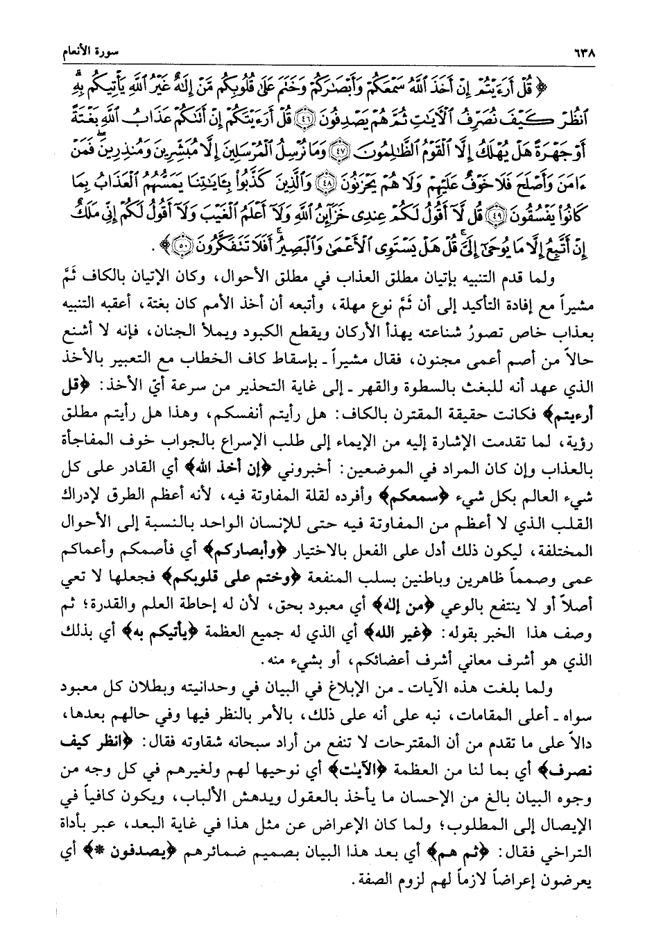 ) قُلْ أَرَأَيْتُمْ إِنْ أَخَذَ اللَّهُ سَمْعَكُمْ وَأَبْصَارَكُمْ وَخَتَمَ عَلَى قُلُوبِكُمْ مَّنْ إِلَهٌ غَيْرُ اللَّهِ يَأْتِيكُمْ بِهِ انْظُرْ كَيْفَ نُصَرِّفُ الآيَاتِ ثُمَّ هُمْ يَصْدِفُونَ قُلْ أَرَأَيْتَكُمْ إِنْ أَتَاكُمْ عَذَابُ اللَّهِ بَغْتَةً أَوْ جَهْرَةً هَلْ يُهْلَكُ إِلاَّ الْقَوْمُ الظَّالِمُونَ وَمَا نُرْسِلُ الْمُرْسَلِينَ إِلاَّ مُبَشِّرِينَ وَمُنذِرِينَ فَمَنْ آمَنَ وَأَصْلَحَ فَلاَ خَوْفٌ عَلَيْهِمْ وَلاَ هُمْ يَحْزَنُونَ وَالَّذِينَ كَذَّبُواْ بِآيَاتِنَا يَمَسُّهُمُ الْعَذَابُ بِمَا كَانُواْ يَفْسُقُونَ قُل لاَّ أَقُولُ لَكُمْ عِندِي خَزَآئِنُ اللَّهِ وَلا أَعْلَمُ الْغَيْبَ وَلا أَقُولُ لَكُمْ إِنِّي مَلَكٌ إِنْ أَتَّبِعُ إِلاَّ مَا يُوحَى إِلَيَّ قُلْ هَلْ يَسْتَوِي الأَعْمَى وَالْبَصِيرُ أَفَلاَ تَتَفَكَّرُونَ ( ( )