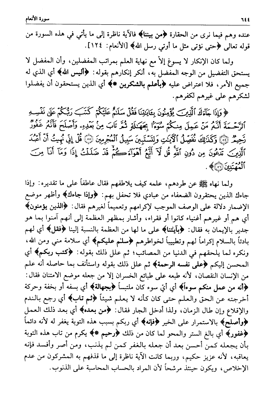 ) وَإِذَا جَآءَكَ الَّذِينَ يُؤْمِنُونَ بِآيَاتِنَا فَقُلْ سَلاَمٌ عَلَيْكُمْ كَتَبَ رَبُّكُمْ عَلَى نَفْسِهِ الرَّحْمَةَ أَنَّهُ مَن عَمِلَ مِنكُمْ سُوءًا بِجَهَالَةٍ ثُمَّ تَابَ مِن بَعْدِهِ وَأَصْلَحَ فَأَنَّهُ غَفُورٌ رَّحِيمٌ وَكَذَلِكَ نفَصِّلُ الآيَاتِ وَلِتَسْتَبِينَ سَبِيلُ الْمُجْرِمِينَ قُلْ إِنِّي نُهِيتُ أَنْ أَعْبُدَ الَّذِينَ تَدْعُونَ مِن دُونِ اللَّهِ قُلْ لاَّ أَتَّبِعُ أَهْوَآءَكُمْ قَدْ ضَلَلْتُ إِذاً وَمَآ أَنَاْ مِنَ الْمُهْتَدِينَ ( ( )