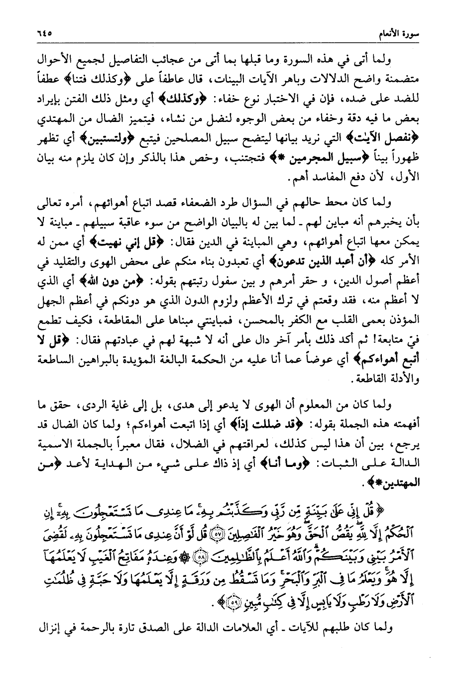 ) قُلْ إِنِّي عَلَى بَيِّنَةٍ مِّن رَّبِّي وَكَذَّبْتُم بِهِ مَا عِندِي مَا تَسْتَعْجِلُونَ بِهِ إِنِ الْحُكْمُ إِلاَّ للَّهِ يَقُصُّ الْحَقَّ وَهُوَ خَيْرُ الْفَاصِلِينَ قُل لَّوْ أَنَّ عِندِي مَا تَسْتَعْجِلُونَ بِهِ لَقُضِيَ الأَمْرُ بَيْنِي وَبَيْنَكُمْ وَاللَّهُ أَعْلَمُ بِالظَّالِمِينَ وَعِندَهُ مَفَاتِحُ الْغَيْبِ لاَ يَعْلَمُهَآ إِلاَّ هُوَ وَيَعْلَمُ مَا فِي الْبَرِّ وَالْبَحْرِ وَمَا تَسْقُطُ مِن وَرَقَةٍ إِلاَّ يَعْلَمُهَا وَلاَ حَبَّةٍ فِي ظُلُمَاتِ الأَرْضِ وَلاَ رَطْبٍ وَلاَ يَابِسٍ إِلاَّ فِي كِتَابٍ مُّبِينٍ ( ( )