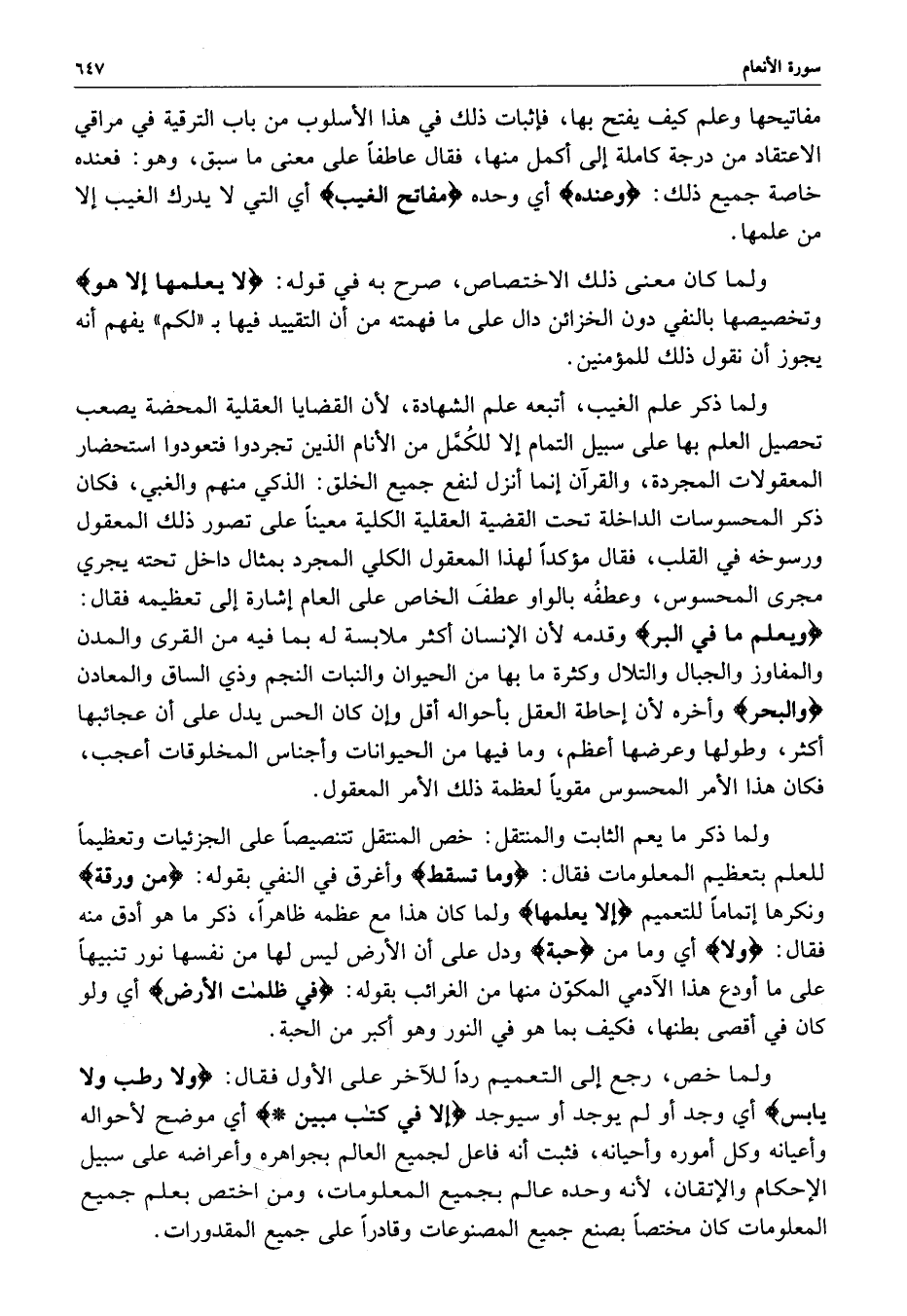 مفاتيحها وعلم كيف يفتح بها ، فإثبات ذلك في هذا الأسلوب من باب الترقية في مراقي الإعتقاد من درجة كاملة إلى أكمل منها ، فقال عاطفاً على معنى ما سبق ، وهو : فعنده خاصة جميع ذلك : ( وعنده ) أي وحده ) مفاتح الغيب ) أي التي لا يدرك الغيب إلا من علمها .