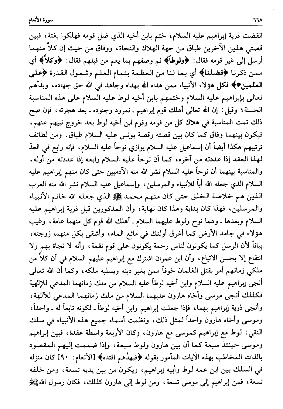 انقضت ذرية إبراهيم عليه السلام ، ختم بابن أخيه الذي ضل قومه فهلكوا بغتة ، فبين قصتي هذين الآخرين طباق من جهة الهلاك والنجاة ، ووفاق من حيث إن كلاًّ منهما أرسل إلى غير قومه فقال : ( ولوطاً ( ثم وصفهم بما يعم من قبلهم فقال : ( وكلاًّ ) أي ممن ذكرنا ) فضلنا ) أي بما لنا من العظمة بتمام العلم وشمول القدرة ) على العالمين ( فكل هؤلاء الأنبياء ممن هداه الله بهداه وجاهد في الله حق جهاده ، وبدأهم تعالى بإبراهيم عليه السلام وختمهم بابن أخيه لوط عليه السلام على هذه المناسبة الحسنة ؛ وقيل : إن الله تعالى أهلك قوم إبراهيم - نمرود وجنوده - بعد هجرته ، فإن صح ذلك تمت المناسبة في هلاك كل من قومه وقوم ابن أخيه لوط بعد خروج نبيهم عنهم ، فيكون بينهما وفاق كما كان بين قصته وقصة يونس عليه السلام طباق .
