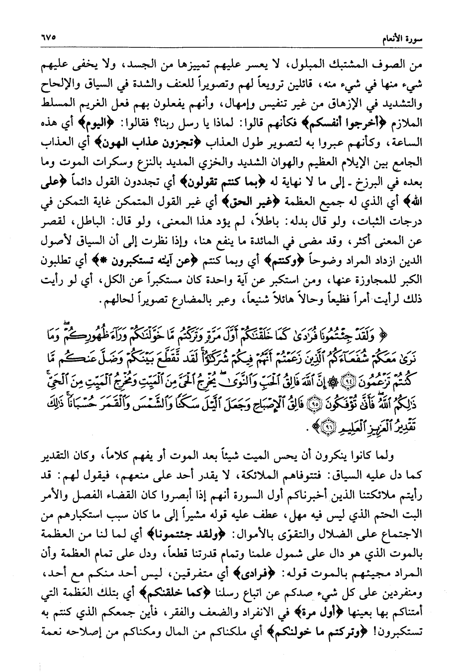 ) وَلَقَدْ جِئْتُمُونَا فُرَادَى كَمَا خَلَقْنَاكُمْ أَوَّلَ مَرَّةٍ وَتَرَكْتُمْ مَّا خَوَّلْنَاكُمْ وَرَاءَ ظُهُورِكُمْ وَمَا نَرَى مَعَكُمْ شُفَعَآءَكُمُ الَّذِينَ زَعَمْتُمْ أَنَّهُمْ فِيكُمْ شُرَكَآءُ لَقَد تَّقَطَّعَ بَيْنَكُمْ وَضَلَّ عَنكُم مَّا كُنتُمْ تَزْعُمُونَ إِنَّ اللَّهَ فَالِقُ الْحَبِّ وَالنَّوَى يُخْرِجُ الْحَيَّ مِنَ الْمَيِّتِ وَمُخْرِجُ الْمَيِّتِ مِنَ الْحَيِّ ذلِكُمُ اللَّهُ فَأَنَّى تُؤْفَكُونَ فَالِقُ الإِصْبَاحِ وَجَعَلَ الْلَّيْلَ سَكَناً وَالشَّمْسَ وَالْقَمَرَ حُسْبَاناً ذلِكَ تَقْدِيرُ الْعَزِيزِ الْعَلِيمِ ( ( )
