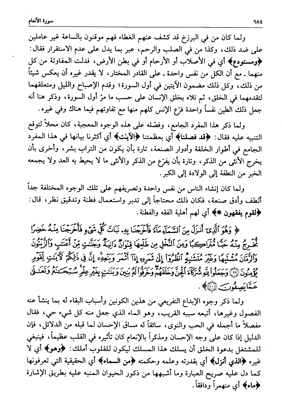 ) وَهُوَ الَّذِي أَنزَلَ مِنَ السَّمَآءِ مَآءً فَأَخْرَجْنَا بِهِ نَبَاتَ كُلِّ شَيْءٍ فَأَخْرَجْنَا مِنْهُ خَضِراً نُّخْرِجُ مِنْهُ حَبّاً مُّتَرَاكِباً وَمِنَ النَّخْلِ مِن طَلْعِهَا قِنْوَانٌ دَانِيَةٌ وَجَنَّاتٍ مِّنْ أَعْنَابٍ وَالزَّيْتُونَ وَالرُّمَّانَ مُشْتَبِهاً وَغَيْرَ مُتَشَابِهٍ انْظُرُواْ إِلِى ثَمَرِهِ إِذَآ أَثْمَرَ وَيَنْعِهِ إِنَّ فِي ذلِكُمْ لآيَاتٍ لِّقَوْمٍ يُؤْمِنُونَ وَجَعَلُواْ للَّهِ شُرَكَآءَ الْجِنَّ وَخَلَقَهُمْ وَخَرَقُواْ لَهُ بَنِينَ وَبَنَاتٍ بِغَيْرِ عِلْمٍ سُبْحَانَهُ وَتَعَالَى عَمَّا يَصِفُونَ ( ( )