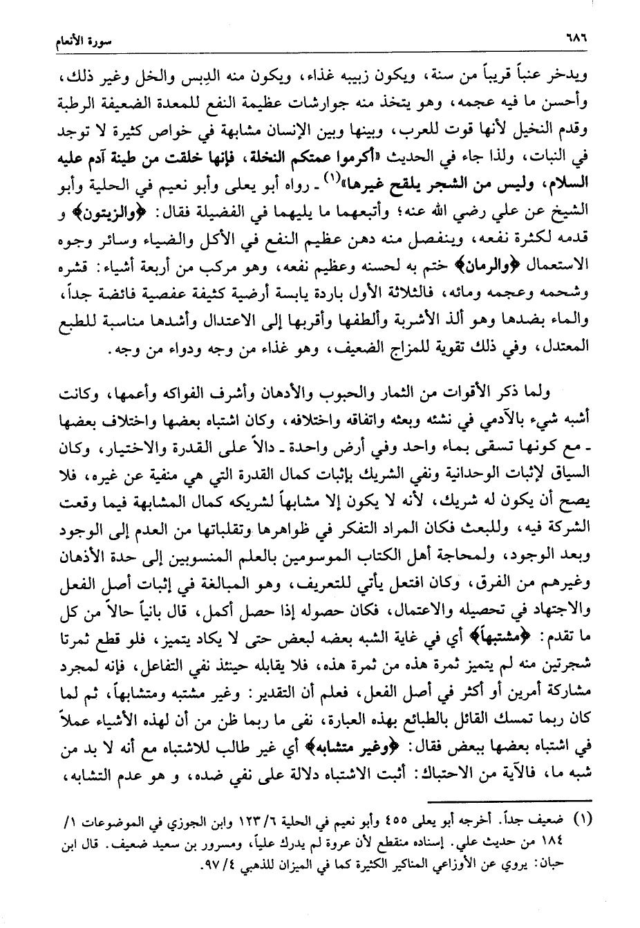 ويدخر عنباً قريباً من سنة ، ويكون زبيبه غذاء ، ويكون منه الدِبس والخل وغير ذلك ، وأحسن ما فيه عجمه ، وهو يتخذ منه جوارشات عظيمة النفع للمعدة الضعيفة الرطبة وقدم النخيل لأنها قوت للعرب ، وبينها وبين الإنسان مشابهة في خواص كثيرة لا توجد في النبات ، ولذا جاء في الحديث ( أكرموا عمتكم النخلة ، فإنها خلقت من طينة آدم عليه السلام ، وليس من الشجر يلقح غيرها ) - رواه أبو يعلى وأبو نعيم في الحلية وأبو الشيخ عن علي رضي الله عنه ؛ وأتبعهما ما يليهما في الفضيلة فقال : ( والزيتون ( و قدمه لكثرة نفعه ، وينفصل منه دهن عظيم النفع في الأكل والضياء وسائر وجوه الاستعمال ) والرمان ( ختم به لحسنه وعظيم نفعه ، وهو مركب من أربعة أشياء : قشره وشحمه وعجمه ومائه ، فالثلاثة الأول باردة يابسة أرضية كثيفة عفصية فائضة جداً ، والماء بضدها وهو ألذ الأشربو وألطفها وأقربها إلى الاعتدال وأشدها مناسبة للطبع المعتدل ، وفي ذلك تقوية للمزاج الضعيف ، وهو غذاء من وجه ودواء من وجه .