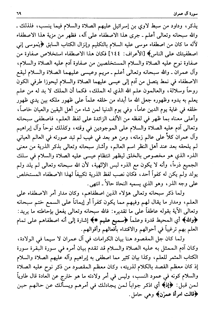 [ الأعراف : 144 ] فكان هذا الاصطفاء استخلاص صفاوة من صفاوة نوح عليه الصلاة والسلام المستخلصين من صفاوة آدم عليه الصلاة والسلام ، وآل عمران - والله سبحانه وتعالى أعلم - مريم وعيسى عليهما الصلاة والسلام ليقع الاصطفاء في نمط يتصل من آدم إلى عيسى عليهما الصلاة والسلام ليحوزوا طرفي الكون روحاً وسلالة ، والعالمون علم الله الذي له الملك ، فكما أن الملك لا بد له من علم يعلم به بدوه وظهوره جعل الله ما أبداه من خلقه علماً على ظهور ملكه بين يدي ظهور خلقه في غاية يوم الدين عاماً ، وفي يوم الدنيا لمن شاء من أهل اليقين والعيان خاصاً ، وأعلى معناه بما ظهر في لفظه من الألف الزائدة على لفظ العلم ، فاصطفى سبحانه وتعالى آدم عليه الصلاة والسلام على الموجودين في وقته ، وكذلك نوحاُ وآل إبراهيم وآل عمران كلاًّ على عالم زمانه ، ومن بعد في غيب لم تبد صورته في العالم العياني الذرء الذي هو مخصوص بالخلق ليظهر انتظام عيسى عليه الصلاة والسلام في سلك الجميع ذرءاًَ ، وأنه لا يكون مع الذرء لبس الإلهية ، لأن الله سبحانه وتعالى لم يلد ولم يولد ولم يكن له كفواً أحد ، فكان نصب لفظ الذرية تكييفاً لهذا الاصطفاء المستخلص على وجه الذر ، وهو الذي يسميه النحاة حالاً - انتهى .