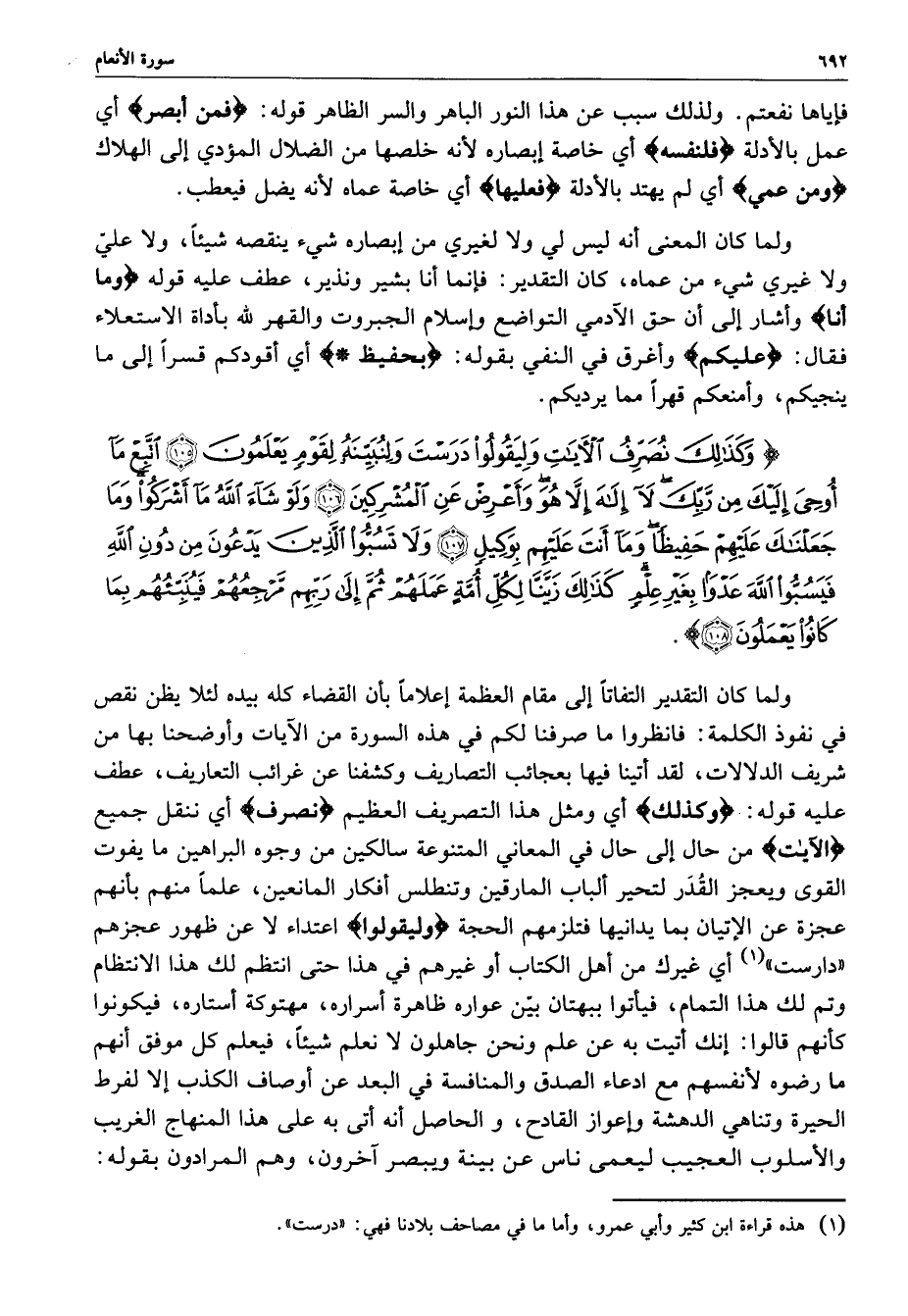 ولما كان التقدير التفاتاً إلى مقام العظمة إعلاماً بأن القضاء كله بيده لئلا يظن نقص في نفوذ الكلمة : فانظروا ما صرفنا لكم في هذه السورة من الآيات وأوضحنا بها من شريف الدلالات ، لقد اتينا فيها بعجائب التصاريف وكشفنا عن غرائب التعاريف ، عطف عليه قوله : ( وكذلك ) أي ومثل هذا التصريف العظيم ) نصرف ) أي ننقل جميع ) الآيات ( من حال إلى حال في المعاني المتنوعة سالكين من وجوه البراهين ما يفوت القوى ويعجز القُدَر لتحير ألباب المارقين وتنطلس أفكار المانعين ، علماً منهم بأنهم عجزة عن الإتيان بما يدانيها فتلزمهم الحجة ) وليقولوا ( اعتداء لا عن ظهور عجزهم ( دارست ) أي غيرك من أهل الكتاب أو غيرهم في هذا حتى انتظم لك هذا الانتظام وتم لك هذا التمام ، فيأتوا ببهتان بيّن عواره ظاهرة أسراره ، مهتوكة أستاره ، فيكونوا كأنهم قالوا : إنك أتيت به عن علم ونحن جاهلون لا نعلم شيئاً ، فيعلم كل موفق أنهم ما رضوه لأنفسهم مع ادعاء الصدق والمنافسة في البعد عن أوصاف الكذب إلا لفرط الحيرة وتناهي الدهشة وإعواز القادح ، والحاصل أنه أتى به على هذا المنهاج الغريب والأسلوب العجيب ليعمى ناس عن بينة ويبصر آخرون ، وهم المرادون بقوله :