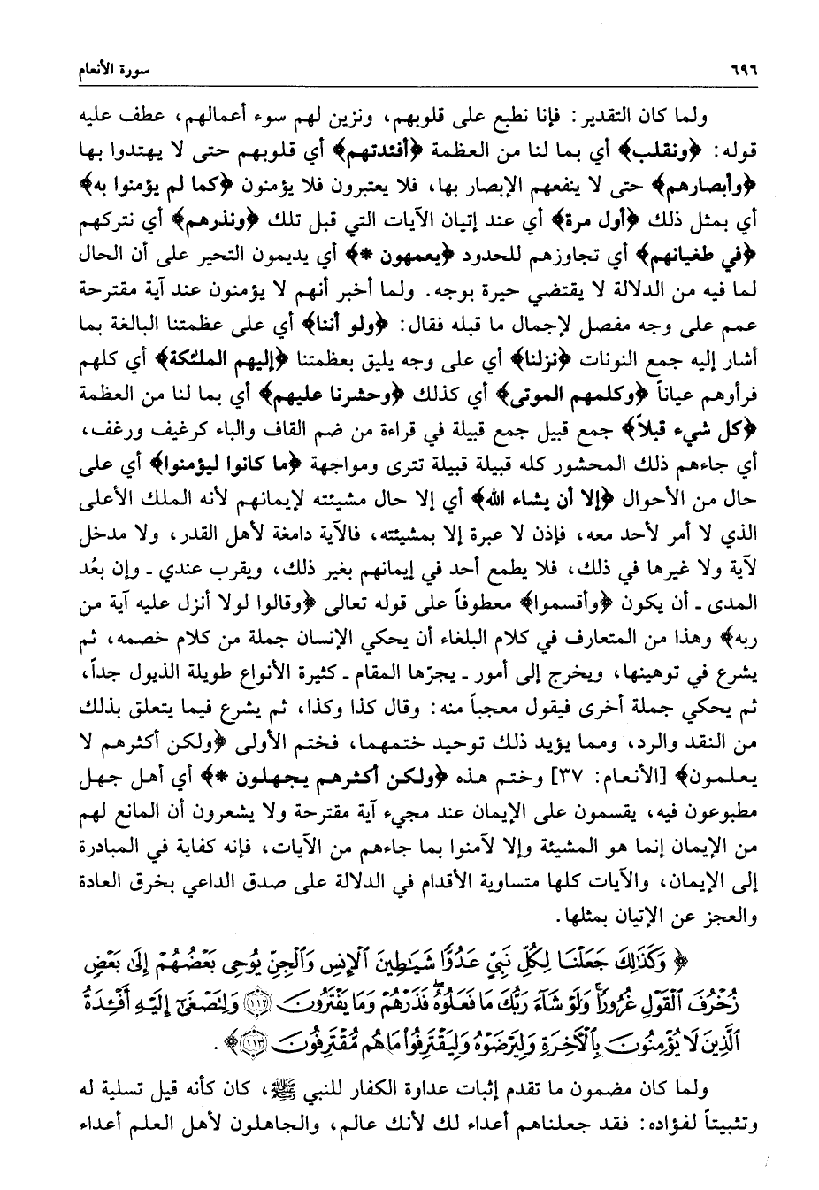 ) وَكَذَلِكَ جَعَلْنَا لِكُلِّ نِبِيٍّ عَدُوّاً شَيَاطِينَ الإِنْسِ وَالْجِنِّ يُوحِي بَعْضُهُمْ إِلَى بَعْضٍ زُخْرُفَ الْقَوْلِ غُرُوراً وَلَوْ شَآءَ رَبُّكَ مَا فَعَلُوهُ فَذَرْهُمْ وَمَا يَفْتَرُونَ وَلِتَصْغَى إِلَيْهِ أَفْئِدَةُ الَّذِينَ لاَ يُؤْمِنُونَ بِالآخِرَةِ وَلِيَرْضَوْهُ وَلِيَقْتَرِفُواْ مَا هُم مُّقْتَرِفُونَ ( ( )