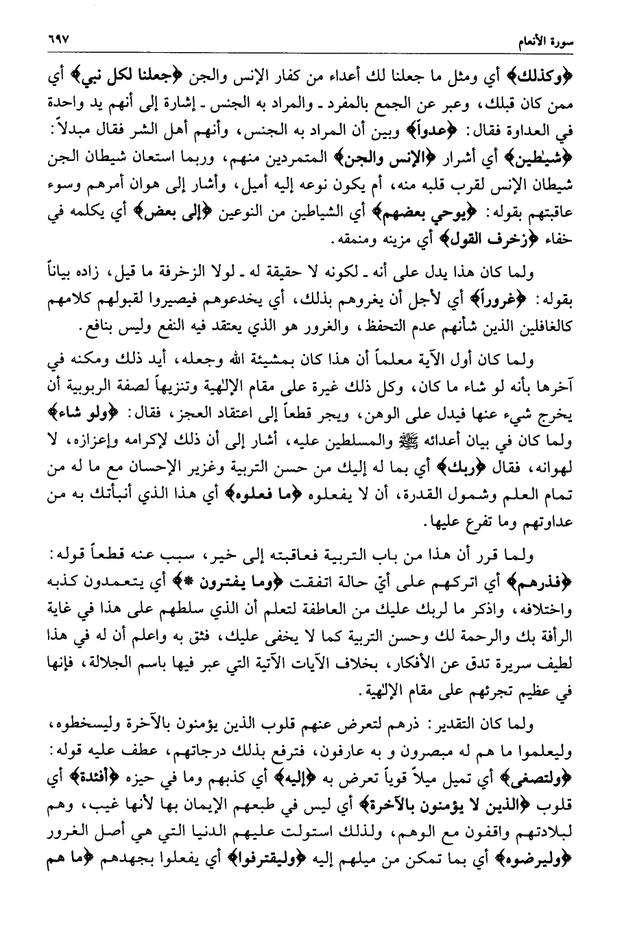 ) وكذلك ) أي ومثل ما جعلنا لك أعداء من كفار الإنس والجن ) جعلنا لكل نبي ) أي ممن كان قبلك ، وعبر عن الجمع بالمفرد - والمراد به الجنس - إشارة إلى أنهم يد واحدة في العداوة فقال : ( عدواً ( وبين أن المراد به الجنس ، وأنهم أهل الشر فقال مبدلاً : ( شياطين ) أي أشرار ) الإنس والجن ( المتمردين منهم ، وربما استعان شيطان الجن شيطان الإنس لقرب قلبه منه ، أم يكون نوعه إليه أميل ، وأشار إلى هوان أمرهم وسوء عاقبتهم بقوله : ( يوحي بعضهم ) أي الشياطين من النوعين ) إلى بعض ) أي يكلمه في خفاء ) زخرف القول ) أي مزينه ومنمقه .