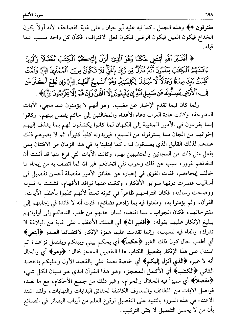 ) أَفَغَيْرَ اللَّهِ أَبْتَغِي حَكَماً وَهُوَ الَّذِي أَنَزَلَ إِلَيْكُمُ الْكِتَابَ مُفَصَّلاً وَالَّذِينَ آتَيْنَاهُمُ الْكِتَابَ يَعْلَمُونَ أَنَّهُ مُنَزَّلٌ مِّن رَّبِّكَ بِالْحَقِّ فَلاَ تَكُونَنَّ مِنَ الْمُمْتَرِينَ وَتَمَّتْ كَلِمَةُ رَبِّكَ صِدْقاً وَعَدْلاً لاَّ مُبَدِّلِ لِكَلِمَاتِهِ وَهُوَ السَّمِيعُ الْعَلِيمُ وَإِن تُطِعْ أَكْثَرَ مَن فِي الأَرْضِ يُضِلُّوكَ عَن سَبِيلِ اللَّهِ إِن يَتَّبِعُونَ إِلاَّ الظَّنَّ وَإِنْ هُمْ إِلاَّ يَخْرُصُونَ ( ( )