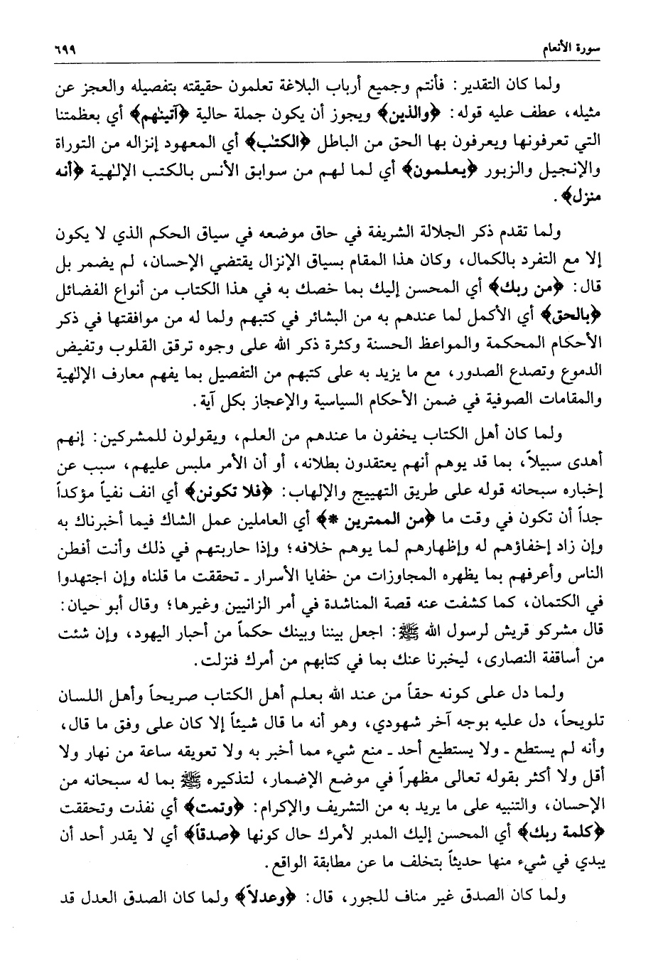ولما تقدم ذكر الجلالة الشريفة في حاق موضعه في سياق الحكم الذي لا يكون إلا مع التفرد بالكمال ، وكان هذا المقام بسياق الإنزال يقتضي الإحسان ، لم يضمر بل قال : ( من ربك ) أي المحسن إليك بما خصك به في هذا الكتاب من أنواع الفضائل ) بالحق ) أي الأكمل لما عندهم به ن البشائر في كتبهم ولما له من موافقتها في ذكر الأحكام المحكمة والمواعظ الحسنة وكثرة ذكر الله على وجوه ترقق القلوب وتفيض الدموع وتصدع الصدور ، مع ما يزيد به على كتبهم من التفصيل بما يفهم معارف الإلهية والمقامات الصوفية في ضمن الأحكام السياسية والإعجاز بكل آية .