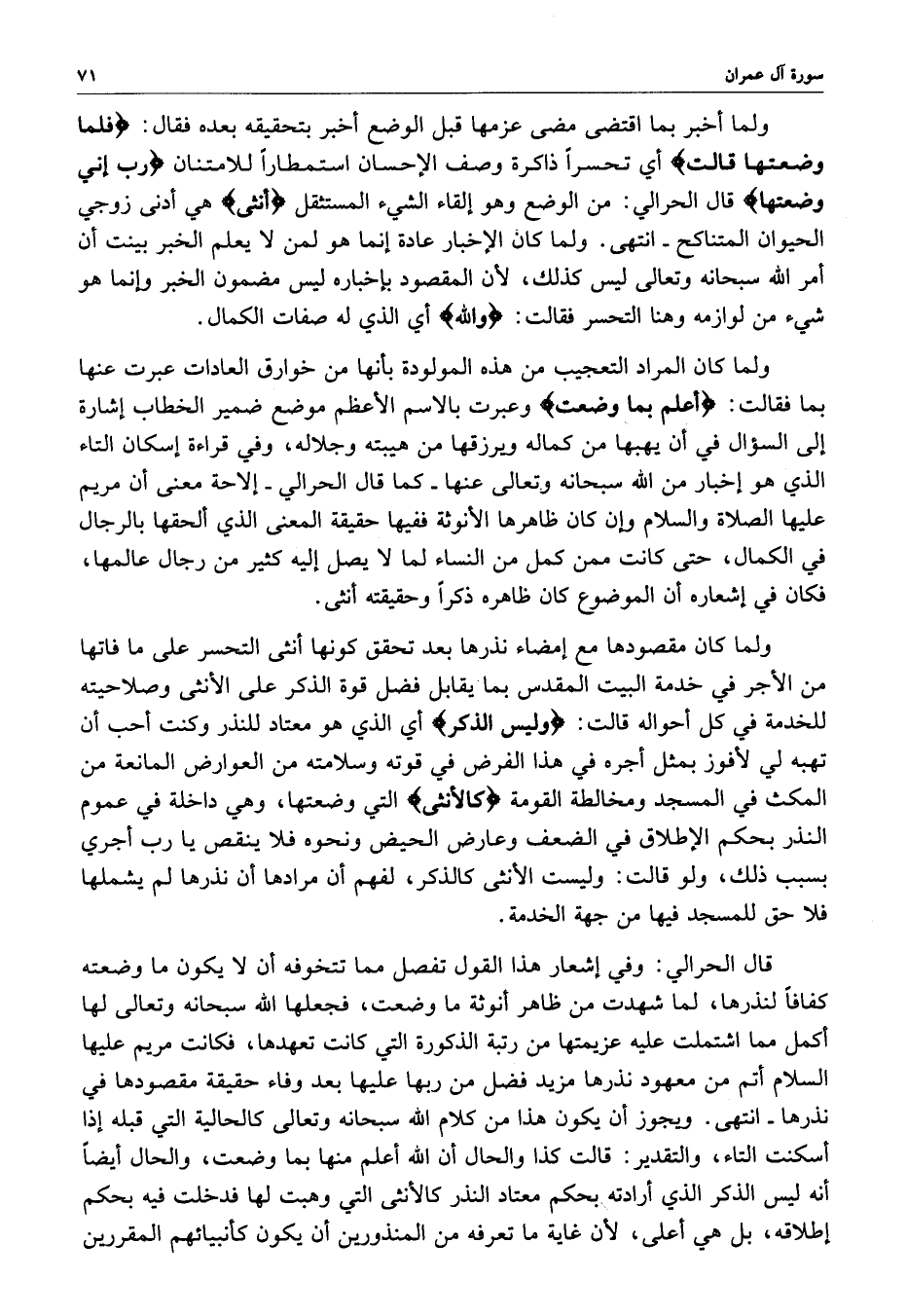 ولما كان مقصودها مع إمضاء نذرها بعد تحقق كوناه أنثى التحسر على ما فاتها من الأجر في خدمة البيت المقدس بما يقابل فضل قوة الذكر على الأنثى وصلاحيته للخدمة في كل أ ؛ واله قالت : ( وليس الذكر ) أي الذي هو معتاد للنذر وكنت أحب أن تهبه لي لأفوز بمثل أجره في هذا الفرض في قوته وسلامته من العوارض المانعة من المكث في المسجد ومخالطة القومة ) كالأنثى ( التي وضعتها ، وهي داخلة في عموم النذر بحكم الإطلاق في الضعف وعارض الحيض ونحوه فلا ينقص يا رب أجري بسبب ذلك ، ولو قالت : وليست الأنثى كالذكر ، لفهم أن مرادها أن نذرها لم يشملها فلا حق للمسجد فيها من جهة الخدمة .