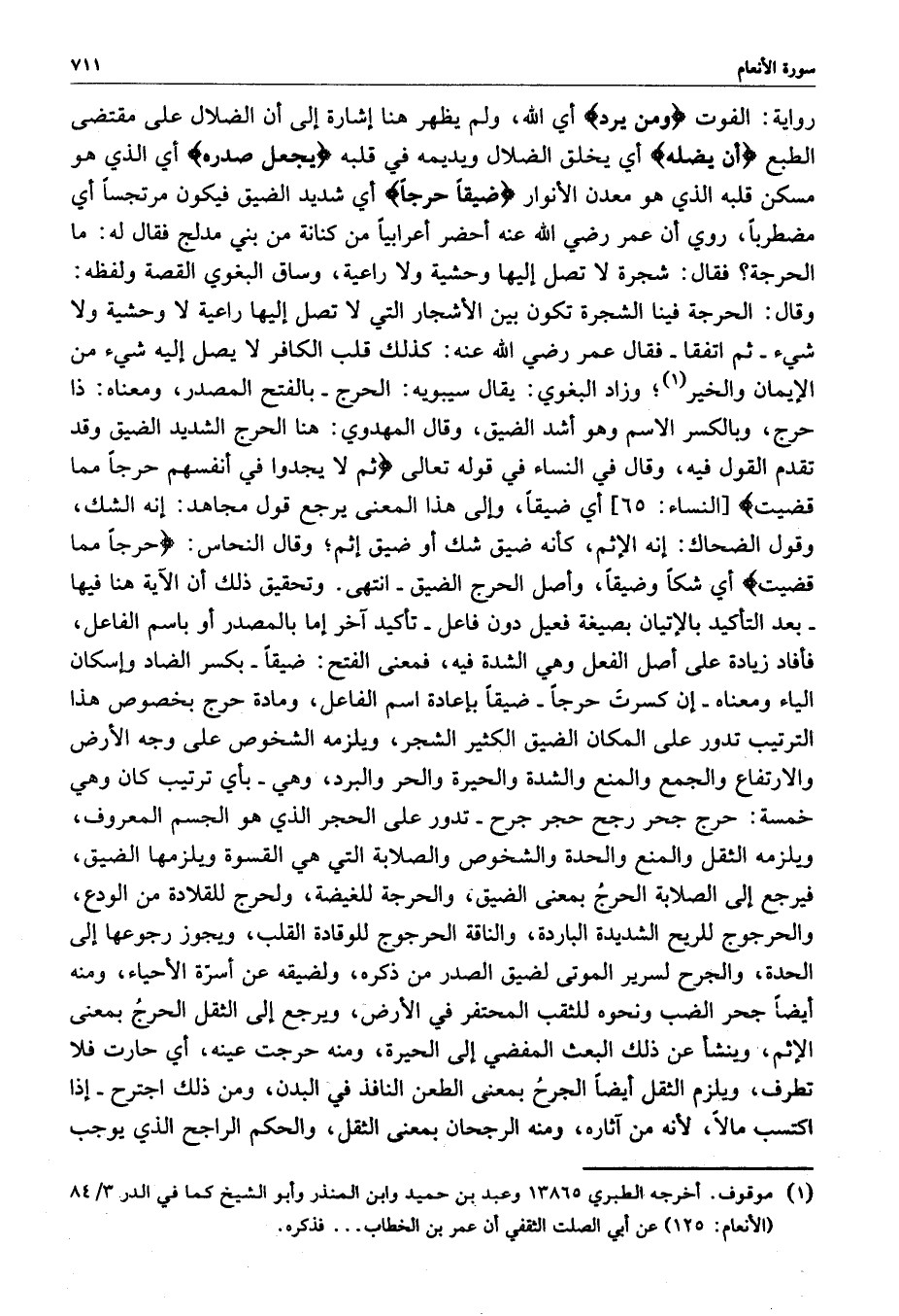 وتحقيق ذلك أن الآية هنا فيها - بعد التأكيد بالإتيان بصيغة فعيل دون فاعل - تأكيد أخر إما بالمصدر أو باسم الفاعل ، فأفاد زيادة على أصل الفعل وهي الشدة فيه ، فمعنى الفتح : ضيقاً - بكسر الضاد وإسكان الياء ومعناه - إن كسرتَ حرجاً - ضيقاً بإعادة اسم الفاعل ، ومادة حرج بخصوص هذا الترتيب تدور على المكان الضيق الكثير الشجر ، ويلزمه الشخوص على وجه الأرض والارتفاع والجمع والمنع والشدة والحيرة والحر والبرد ، وهي - بأي ترتيب كان وهي خمسة : حرج جحر رجح حجر جرح - تدور على الحجر الذي هو الجسم المعروف ، ويلزمه الثقل والمنع والحدة والشخوص والصلابة التي هي القسوة ويلزمها الضيق ، فيرجع إلى الصلابة الحرجُ بمعنى الضيق ، والحرجة للغيضة ، ولحرج للقلادة من الودع ، والحرجوج للريح الشديدة الباردة ، والناقة الحرجوج للوقادة القلب ، ويجوز رجوعها إلى الحدة ، والجرح لسرير الموتى لضيق الصدر من ذكره ، ولضيقه عن أسرّة الأحياء ، ومنه أيضاً جحر الضب ونحوه للثقب المحتفر في الأرض ، ويرجع إلى الثقل الحرجُ بمعنى الإثم ، وينشأ عن ذلك البعث المفضي غلى الحيرة ، ومنه حرجت عينه ، أي حارت فلا تطرف ، ويلزم الثقل أيضاً الجرحُ بمعنى الطعن النافذ في البدن ، ومن ذلك اجترح - إذا اكتسب مالاً ، لأنه من آثاره ، ومنه الرجحان بمعنى الثقل ، والحكم الراجح الذي يوجب