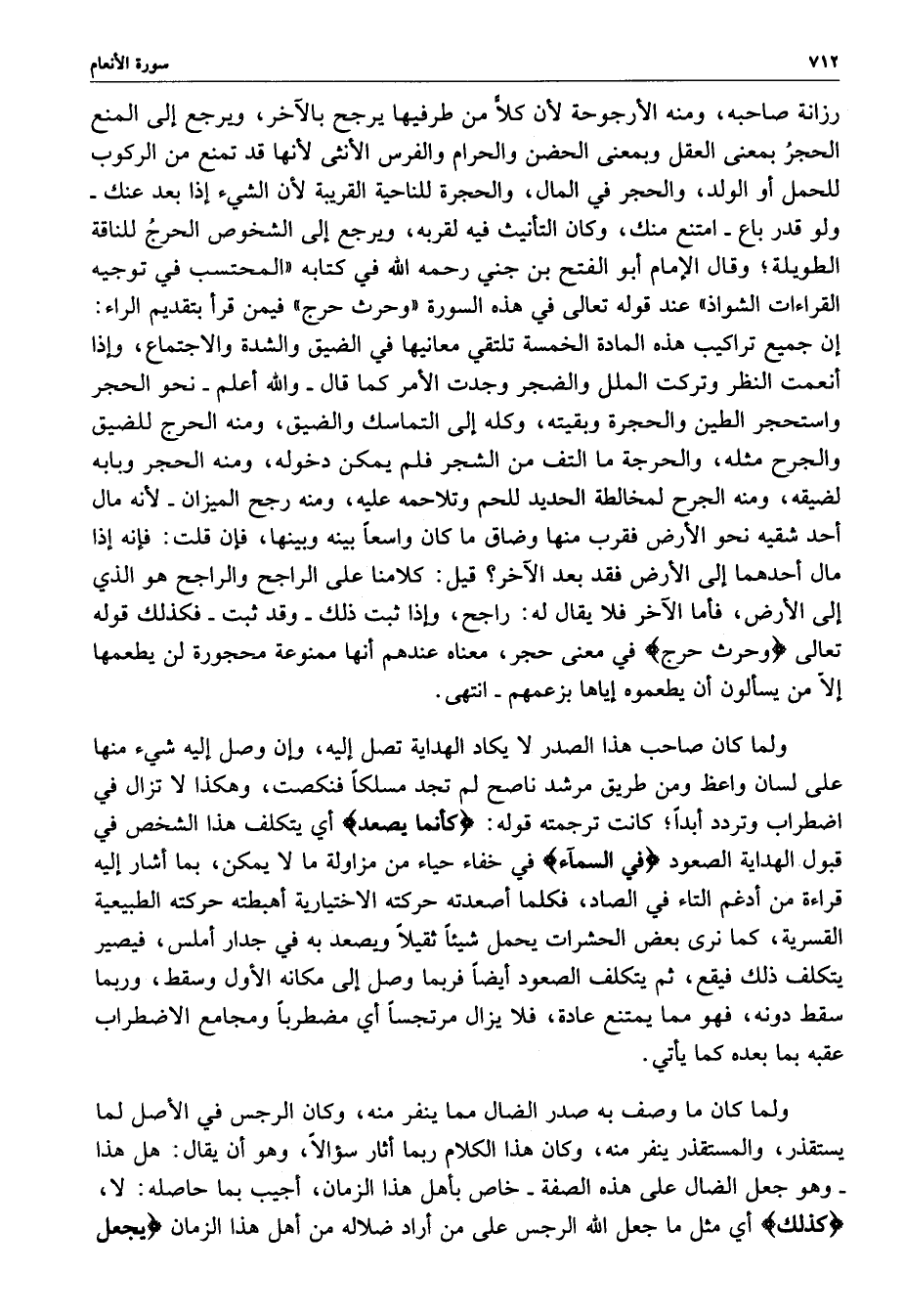 رزانة صاحبه ، ومنه الأرجوحة لأن كلاًّ من طرفيها يرجح بالآخر ، ويرجع إلى المنع الحجرُ بمعنى العقل وبمعنى الحضن والحرام والفرس الأنثى لأنها قد تمنع من الركوب للحمل أو الولد ، والحجر في المال ، والحجرة للناحية القريبة لأن الشيء إذا بعد عنك - ولو قدر باع - امتنع منك ، وكان التأنيث فيه لقربه ، ويرجع إلى الشخوص الحرجُ للناقة الطويلة ؛ وقال الإمام أبو الفتح بن جني رحمه الله في كتابه ( المحتسب في توجيه القراءات الشواذ ) عند قوله تعالى في هذه السورة ( وحرث حرج ) فيمن قرأ بتقديم الراء : إن جميع تراكيب هذه المادة الخمسة تلتقي معانيها في الضيق والشدة والاجتماع ، وإذا أنعمت النظر وتركت الملل والضجر وجدت الأمر كما قال - والله أعلم - نحو الحجر واستحجر الطين والحجرة وبقيته ، وكله إلى التماسك والضيق ، ومنه الحرج للضيق والجرح مثله ، والحرجة ما التف من الشجر فلم يمكن دخوله ، ومنه الحجر وبابه لضيقه ، ومنه الجرح لمخالطة الحديد للحم وتلاحمه عليه ، ومنه رجح الميزان - لأنه مال أحد شقيه نحو الأرض فقرب منها وضاق ما كان واسعاً بينه وبينها ، فإن قلت : فإنه إذا مال أحدهما إلى الأرض فقد بعد الآخر ؟ قيل : كلامنا على الراجح والراجح هو الذي إلى الأرض ، فأما الآخر فلا يقال له : راجح ، وإذا ثبت ذلك - وقد ثبت - فكذلك قوله تعالى ) وحرث حرج ( في معنى حجر ، معناه عندهم أنها ممنوعة محجورة لن يطعمها إلاّ من يسألون أن يطعموه إياها بزعمهم - انتهى .