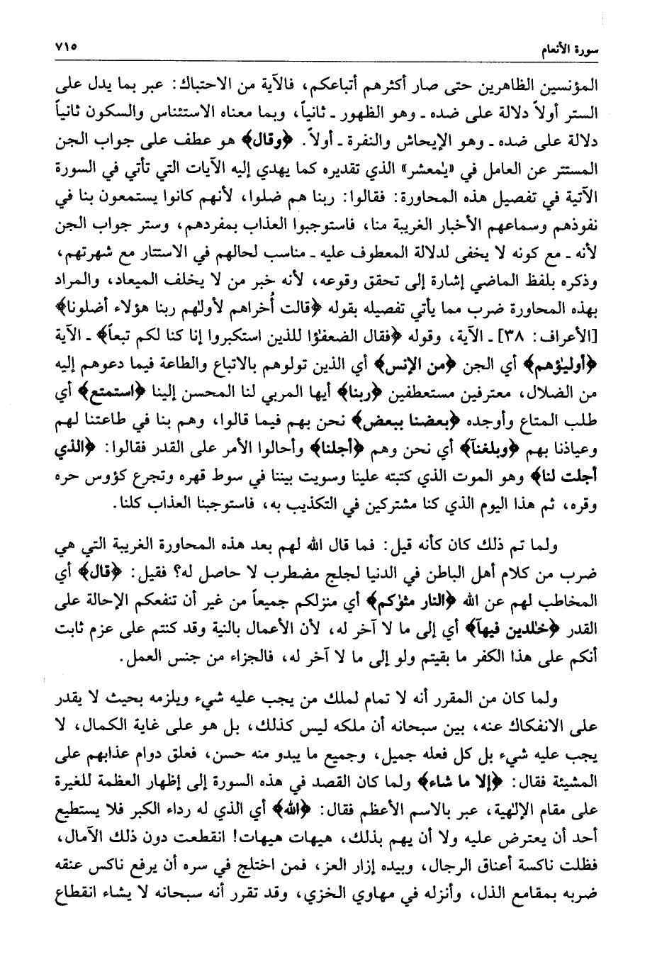 [ الأعراف : 38 ] - الآية ، وقوله ) فقال الضعفاء للذين استكبروا إنا كنا لكم تبعاً ( - الآية ) أولياؤهم ) أي الجن ) من الإنس ) أي الذين تولوهم بالاتباع والطاعة فيما دعوهم إليه من الضلال ، معترفين مستعطفين ) ربنا ( أيها المربي لنا المحسن إلينا ) استمتع ) أي طلب المتاع وأوجده ) بعضنا ببعض ( نحن بهم فيما قالوا ، وهم بنا في طاعتنا لهم وعياذنا بهم ) وبلغنا ) أي نحن وهم ) أجلنا ( وأحالوا الأمر على القدر فقالوا : ( الذي أجلت لنا ( وهو الموت الذي كتبته علينا وسويت بيننا في سوط قهره وتجرع كؤوس حره وقره ، ثم هذا اليوم الذي كنا مشتركين في التكذيب به ، فاستوجبنا العذاب كلنا .