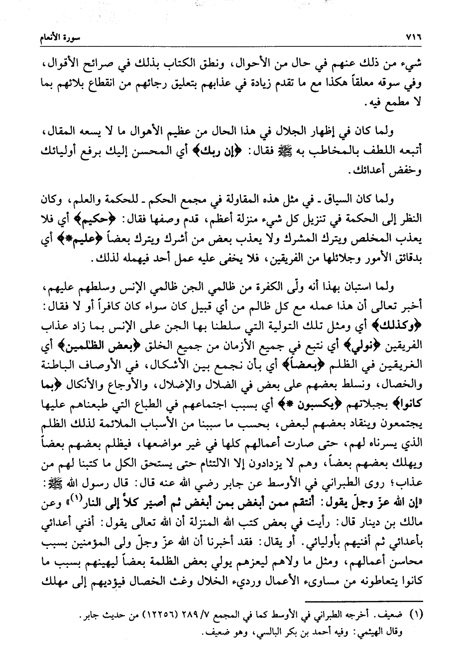 ولما استبان بهذا أنه ولّى الكفرة من ظالمي الجن ظالمي الإنس وسلطهم عليهم ، أخبر تعالى أن هذا عمله مع كل ظالم من أي قبيل كان سواء كان كافراً أو لا فقال : ( وكذلك ) أي ومثل تلك التولية التي سلطنا بها الجن على الإنس بما زاد عذاب الفريقين ) نولي ) أي نتبع في جميع الأزمان من جميع الخلق ) بعض الظالمين ) أي الغريقين في الظلم ) بعضاً ) أي بأن نجمع بين الأشكال ، في الأوصاف الباطنة والخصال ، ونسلط بعضهم على بعض في الضلال والإضلال ، والأوجاع والأنكال ) بما كانوا ( بجبلاتهم ) يكسبون ) أي بسبب اجتماعهم في الطباع التي طبعناهم عليها يجتمعون وينقاد بعضهم لبعض ، بحسب ما سببنا من الأسباب الملائمة لذلك الظلم الذي يسرناه لهم ، حتى صارت أعمالهم كلها في غير مواضعها ، فيظلم بعضهم بعضاً ويهلك بعضهم بعضاً ، وهم لا يزدادون إلا الالتئام حتى يستحق الكل ما كتبنا لهم من عذاب ؛ روى الطبراني في الأوسط ن جابر رضي الله عنه قال : قال رسول الله ( صلى الله عليه وسلم ) : ( إن الله عزّ وجلّ يقول : أنتقم ممن أبغض بمن أبغض ثم أصيّر كلاًّ إلى النار ) وعن مالك بن دينار قال : رأيت في بعض كتب الله المنزلة أن الله تعالى يقول : افني أعدائي بأعدائي ثم أفنيهم بأوليائي .
