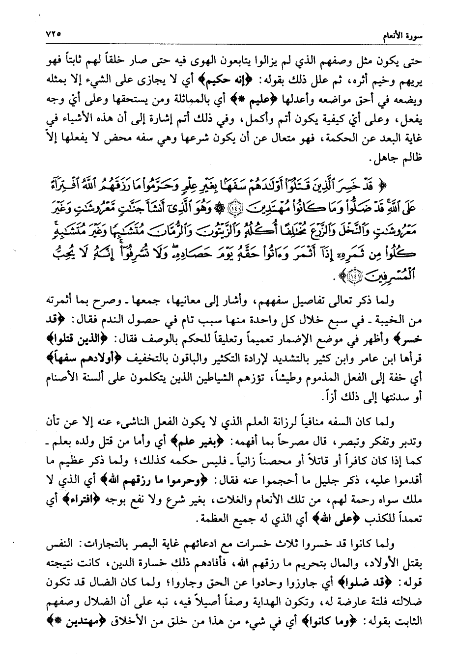 ) قَدْ خَسِرَ الَّذِينَ قَتَلُواْ أَوْلاَدَهُمْ سَفَهاً بِغَيْرِ عِلْمٍ وَحَرَّمُواْ مَا رَزَقَهُمُ اللَّهُ افْتِرَآءً عَلَى اللَّهِ قَدْ ضَلُّواْ وَمَا كَانُواْ مُهْتَدِينَ وَهُوَ الَّذِي أَنشَأَ جَنَّاتٍ مَّعْرُوشَاتٍ وَغَيْرَ مَعْرُوشَاتٍ وَالنَّخْلَ وَالزَّرْعَ مُخْتَلِفاً أُكُلُهُ وَالزَّيْتُونَ وَالرُّمَّانَ مُتَشَابِهاً وَغَيْرَ مُتَشَابِهٍ كُلُواْ مِن ثَمَرِهِ إِذَآ أَثْمَرَ وَآتُواْ حَقَّهُ يَوْمَ حَصَادِهِ وَلاَ تُسْرِفُواْ إِنَّهُ لاَ يُحِبُّ الْمُسْرِفِينَ ( ( )